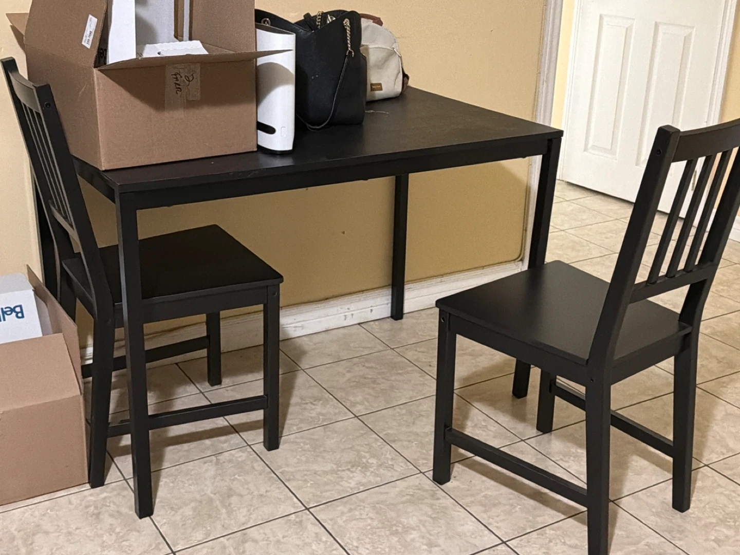 Selling a black dining table with two chairs. The set is in good condition and perfect for a small space or apartment. The table is sturdy and the chairs are comfortable. A great set for anyone looking to furnish their dining area!