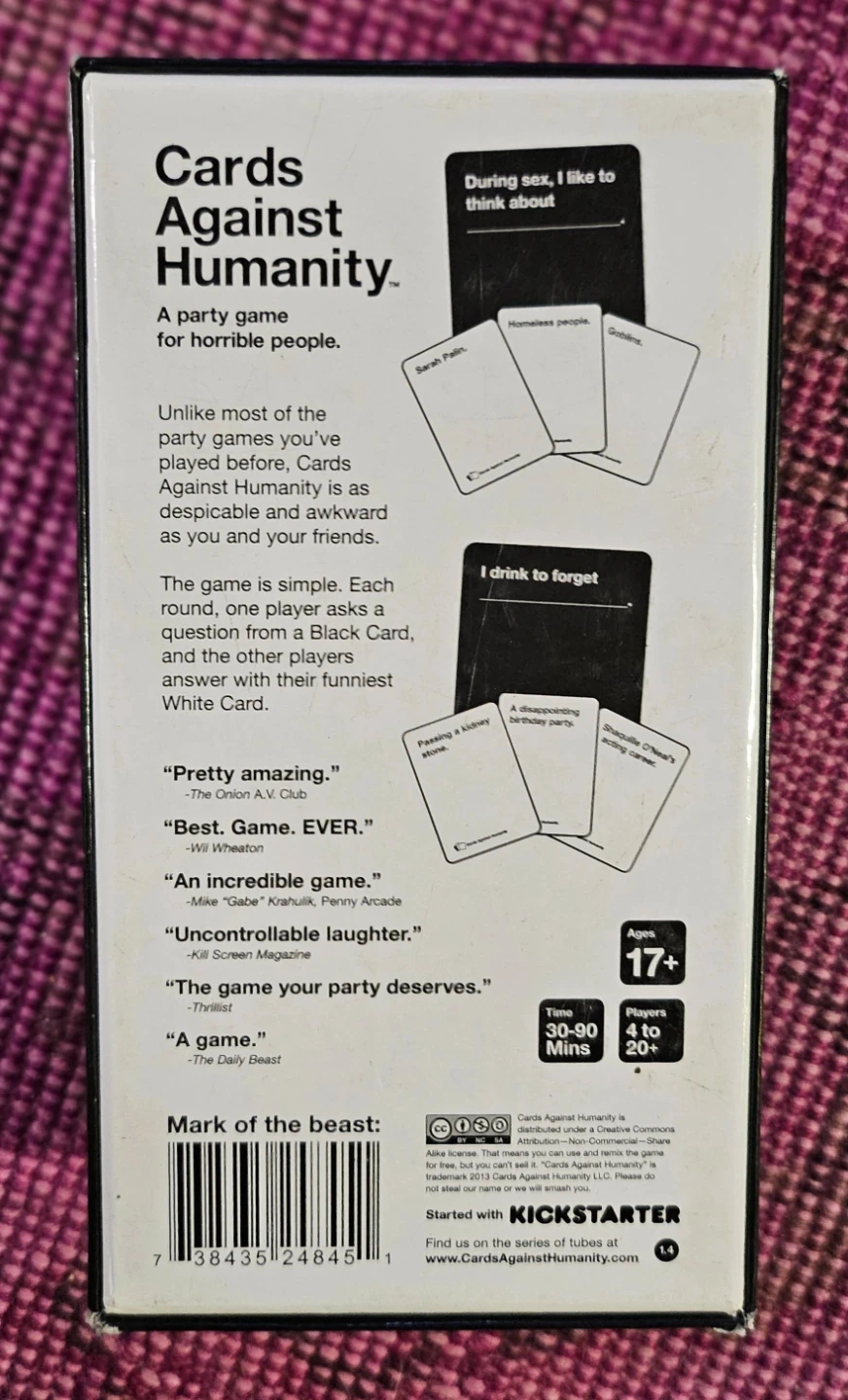 Selling a Cards Against Humanity party game for horrible people! It's a fun game for adults 17+, with a playtime of 30-90 minutes and can accommodate 4 to 20+ players. Get ready for some laughs!