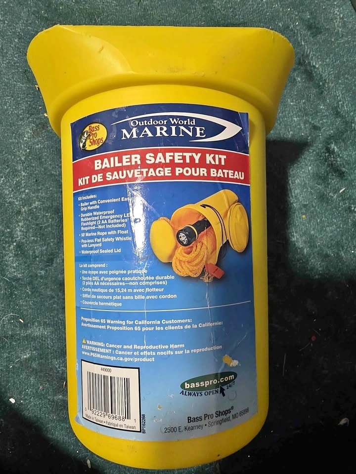 Bailey with convenient Easy Grip Handle, Durable Waterproof Rubberized Emergency LED flashlight , 50' marine rope with float , pea-less flat safety whistles with lanyard, and a waterproof sealed lid. Great gift for someone who owns a boat or fishes