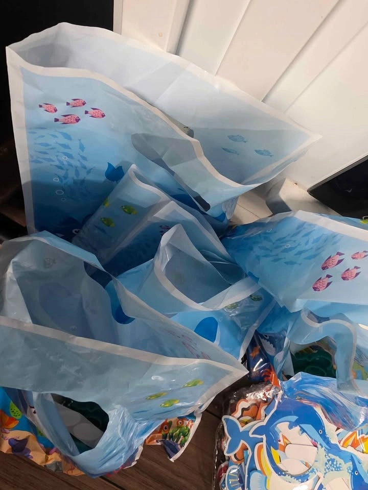 Two large Happy Birthday Canvas backdrops (approx size 2feet by 5 feet), happy birthday banner, under the sea hanging decor, two foil baby shark balloons, pink fog masks, under the sea masks, Birthday cake topper, and made up loot bags with extra bags. Everything you need for the party.
