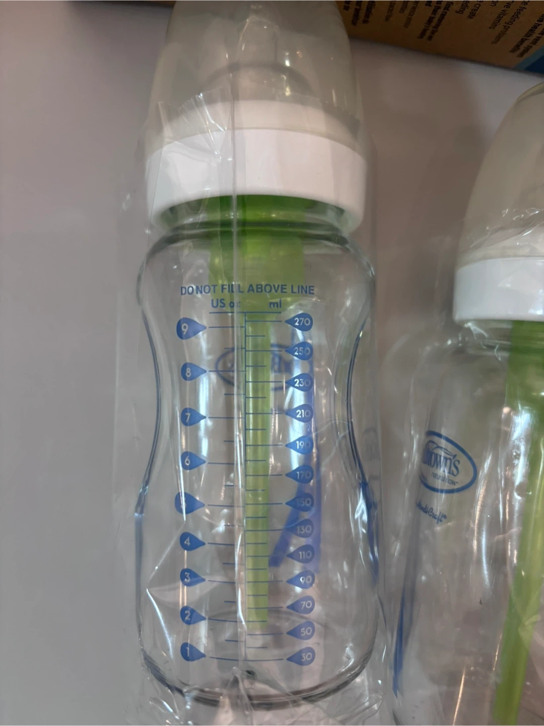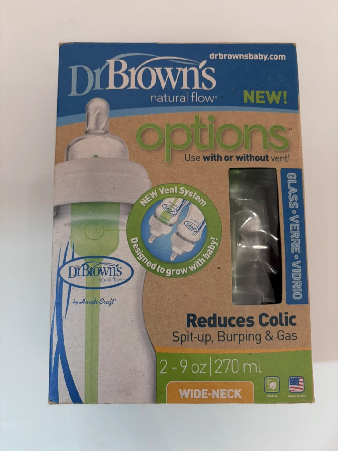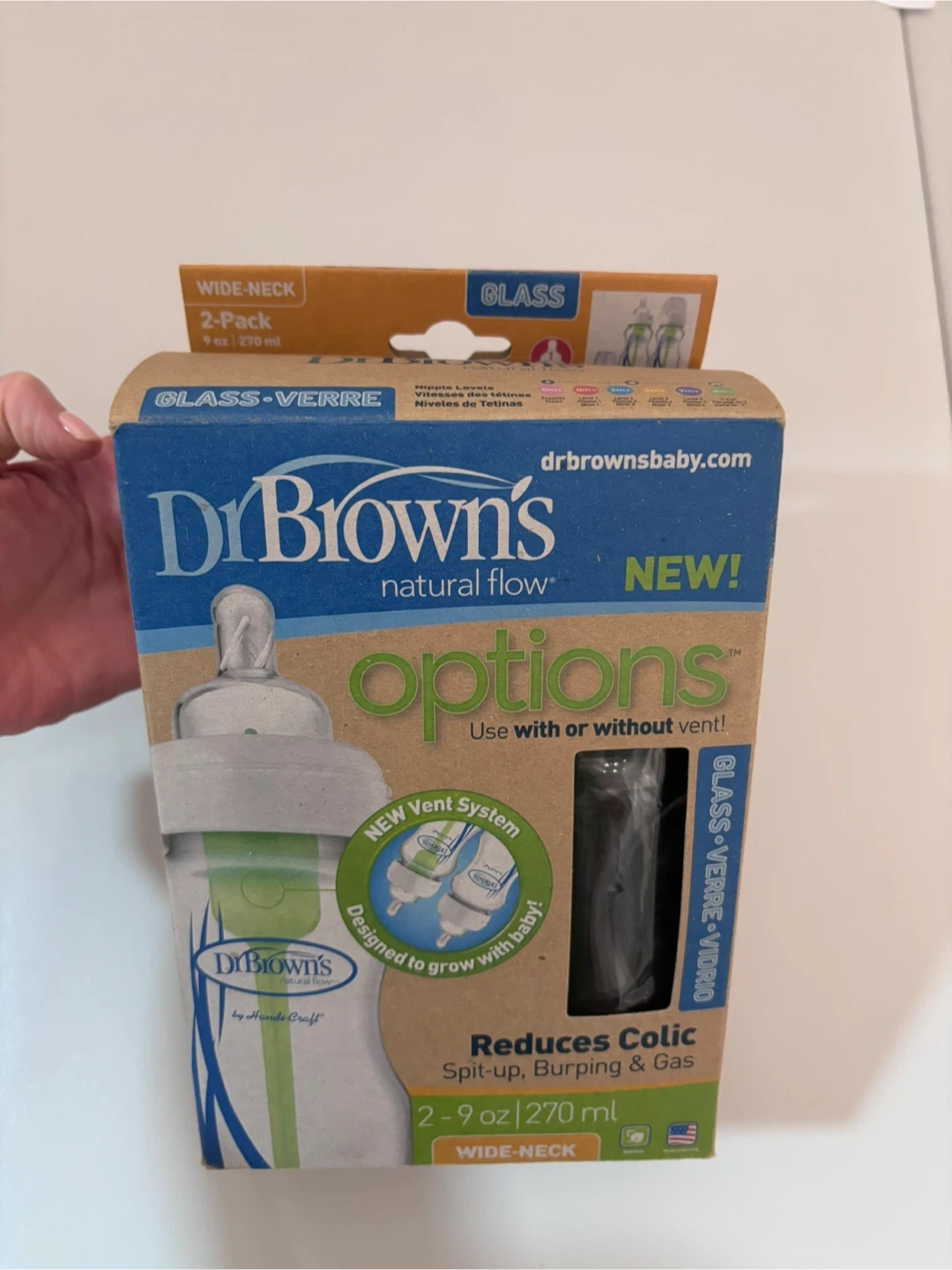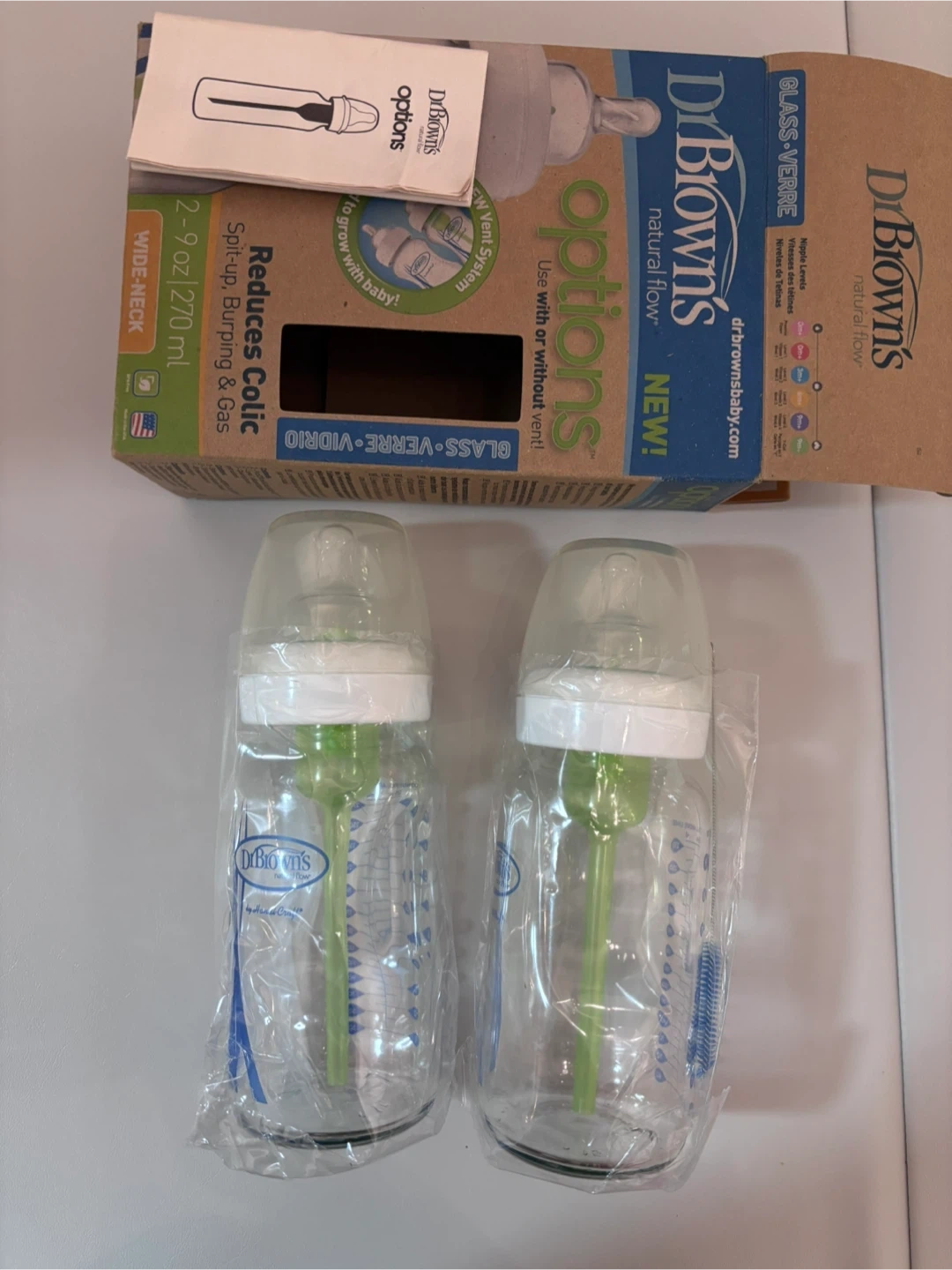 I have a brand new Dr. Brown's Natural Flow Options+ glass baby bottle set! This is a 2-pack of wide-neck bottles, each holding 9 oz / 270 ml. They're designed to reduce colic, spit-up, burping, and gas. Comes with the box and instructions!