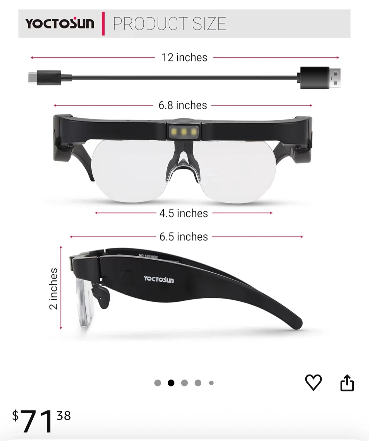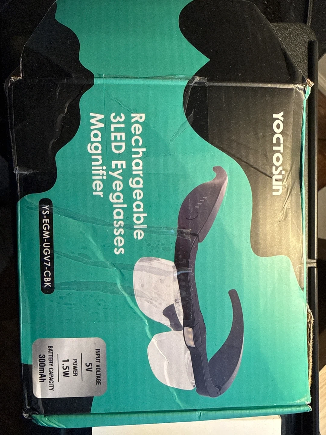 Selling a YOCTOSUN rechargeable 3LED eyeglasses magnifier. It comes with the box! The dimensions are: