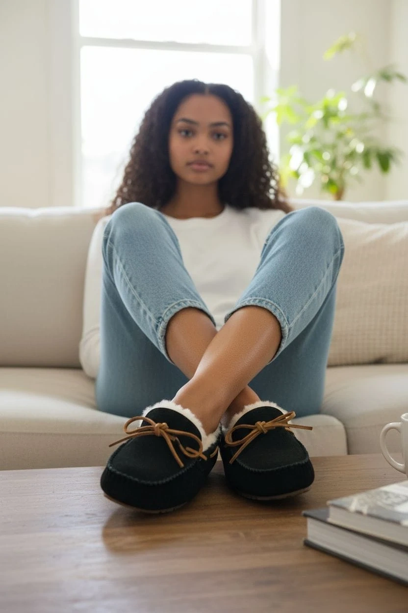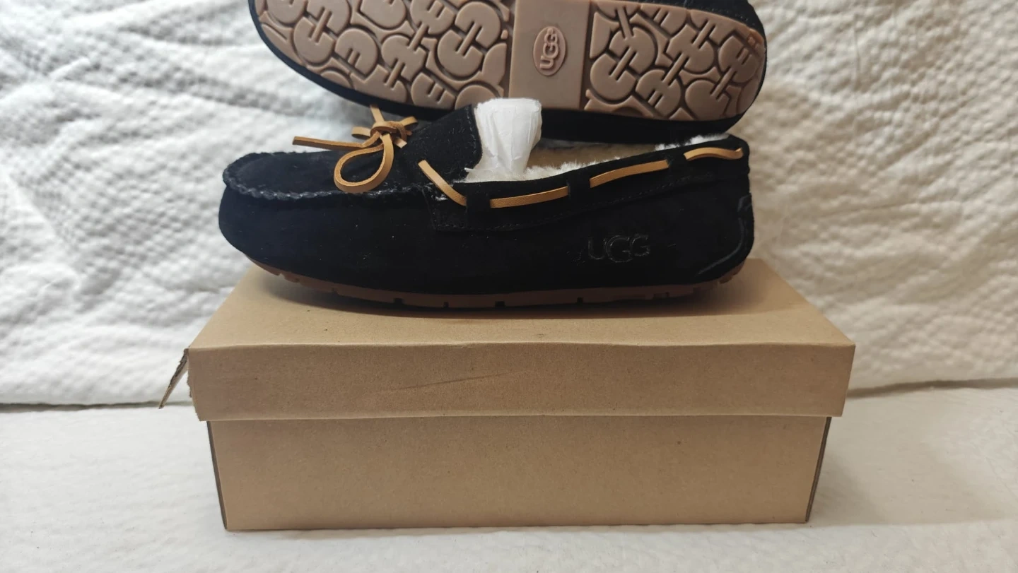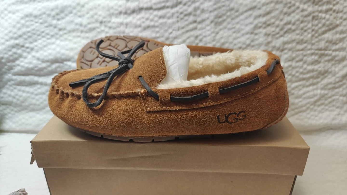 Cozy UGG Ansley moccasin slippers, perfect for indoor comfort! These slippers feature a suede upper and a plush lining to keep your feet warm. The rubber outsole provides traction for light outdoor wear. Comes with the original box!