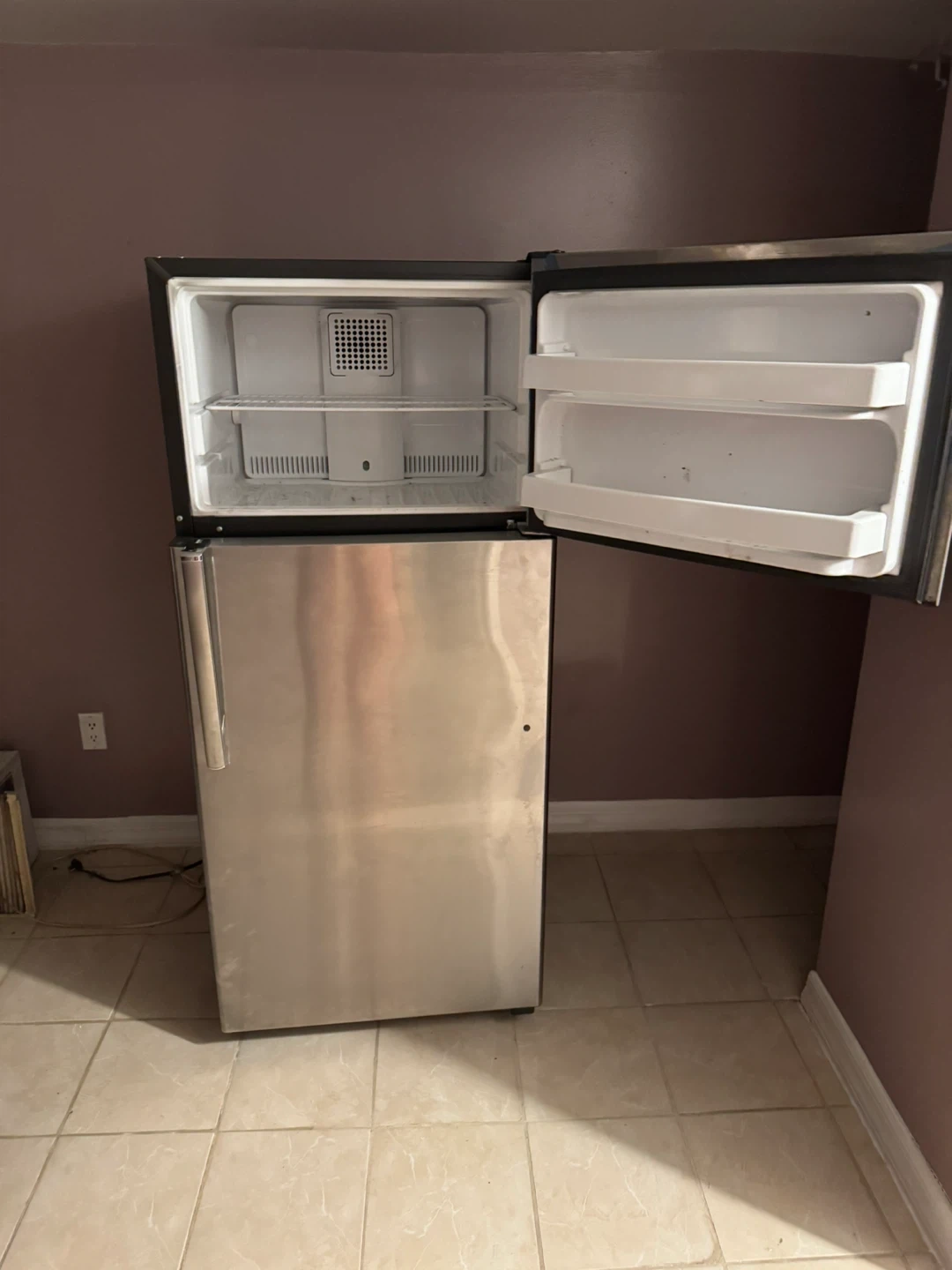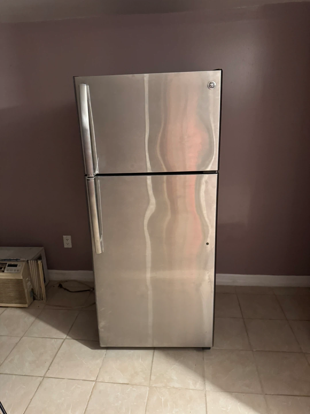 Selling a GE refrigerator in stainless steel. It's a great addition to any kitchen. It has a top freezer and plenty of space for all your groceries. Perfect for a small family or apartment