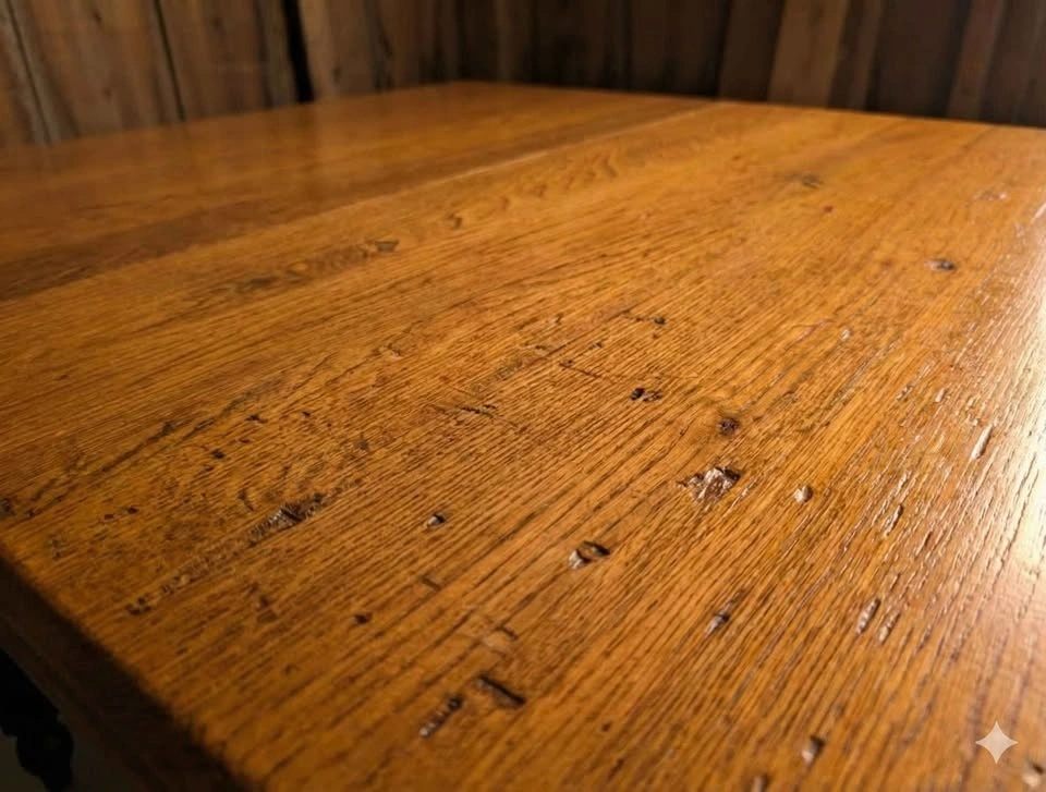 The Top: Stripped and refinished to reveal the beautiful oak grain. I intentionally preserved the rustic character, marks, and patina of the wood—I didn't want it to look "new," I wanted it to look like it has a story to tell.