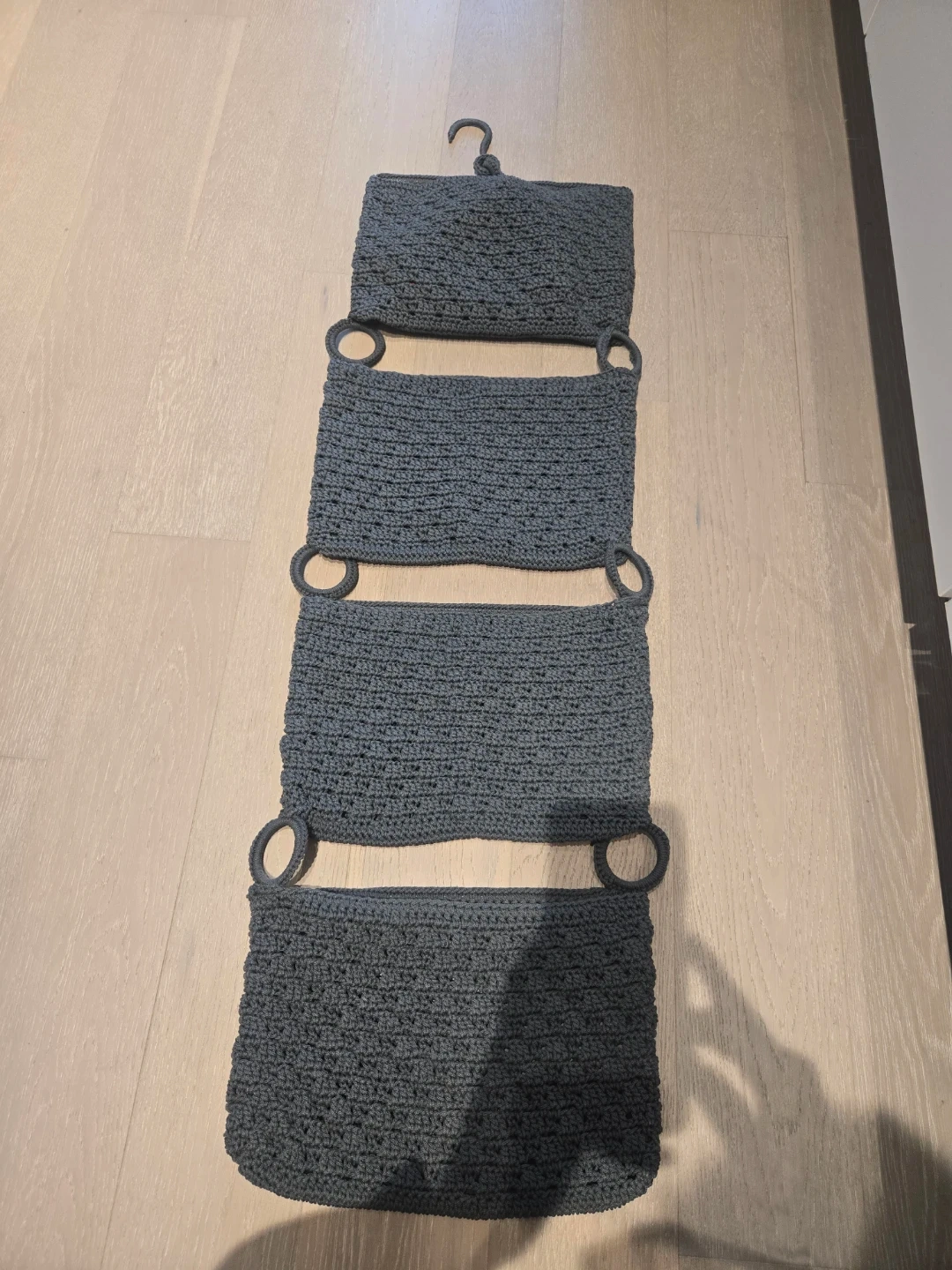 This is a crochet hanging organizer! It's perfect for decluttering and adding a touch of handmade charm to your space. It features multiple tiers for storing various items, and the crochet design adds a unique texture and visual appeal