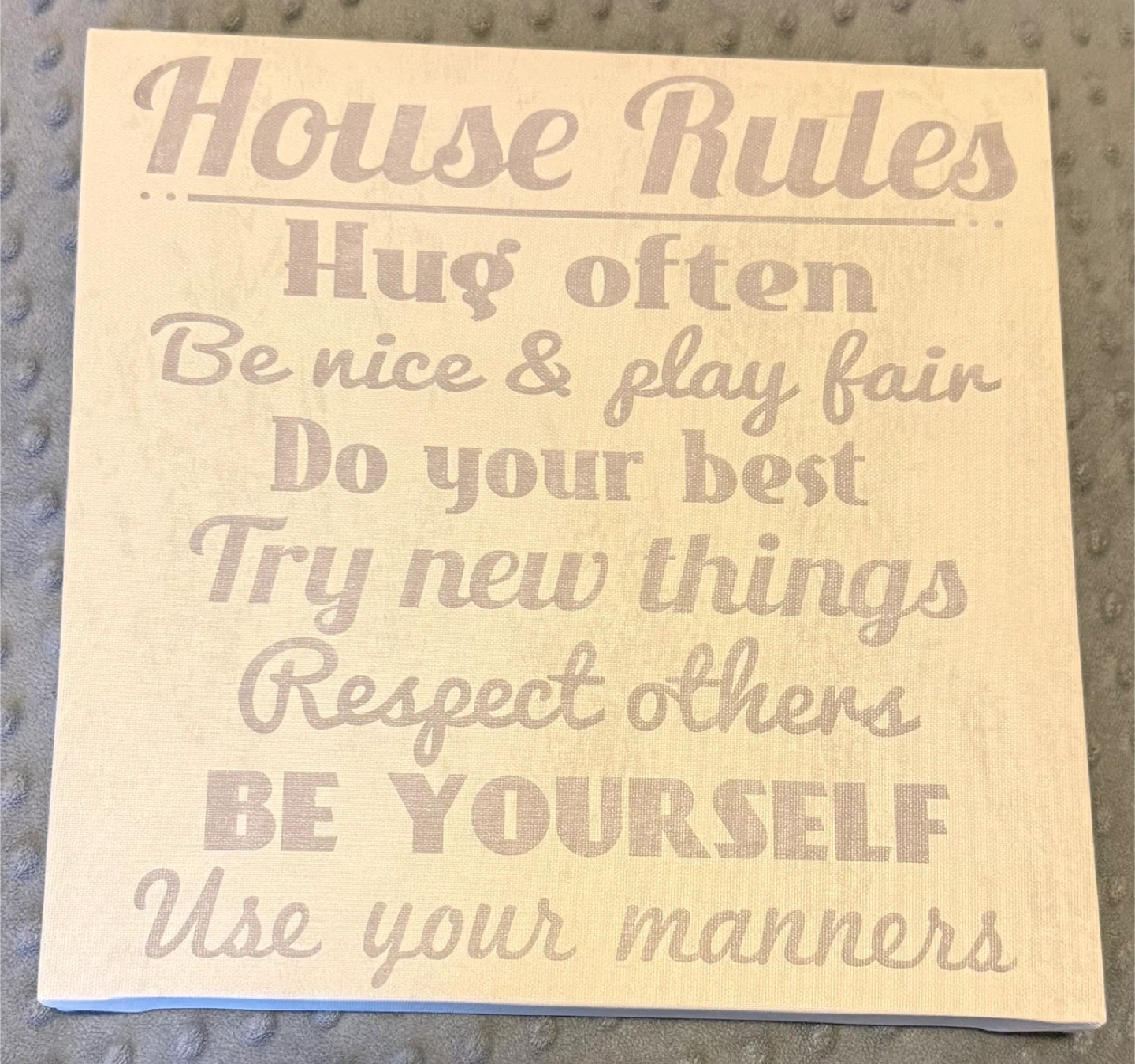 A canvas print featuring a list of house rules. The rules encourage positive behaviour and values, such as hugging often, being nice, playing fair, doing your best, trying new things, respecting others, being yourself, and using your manners