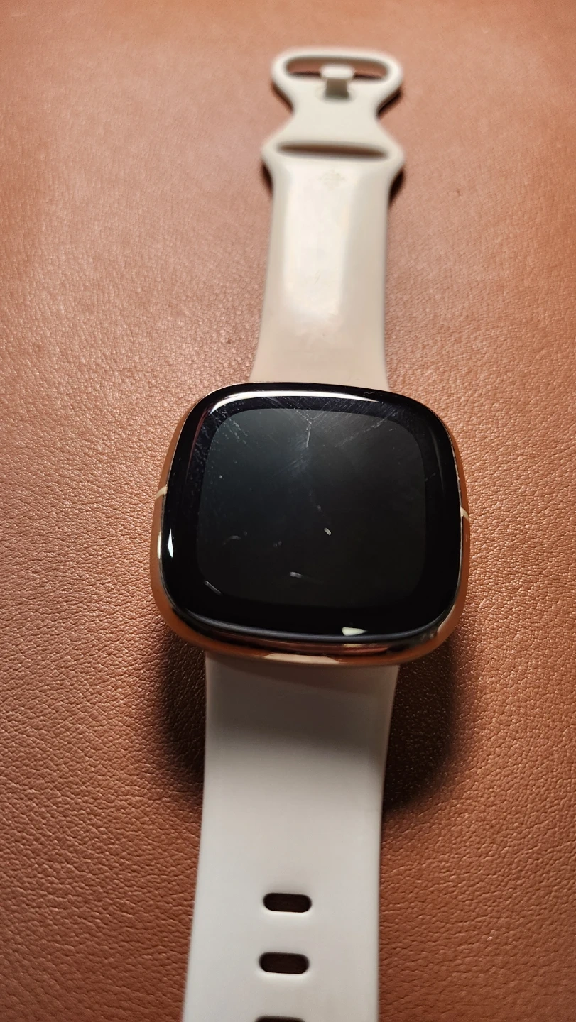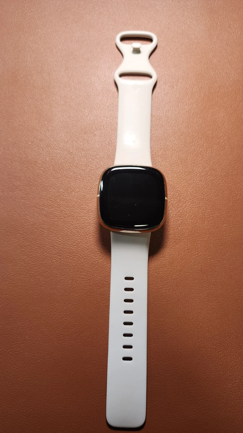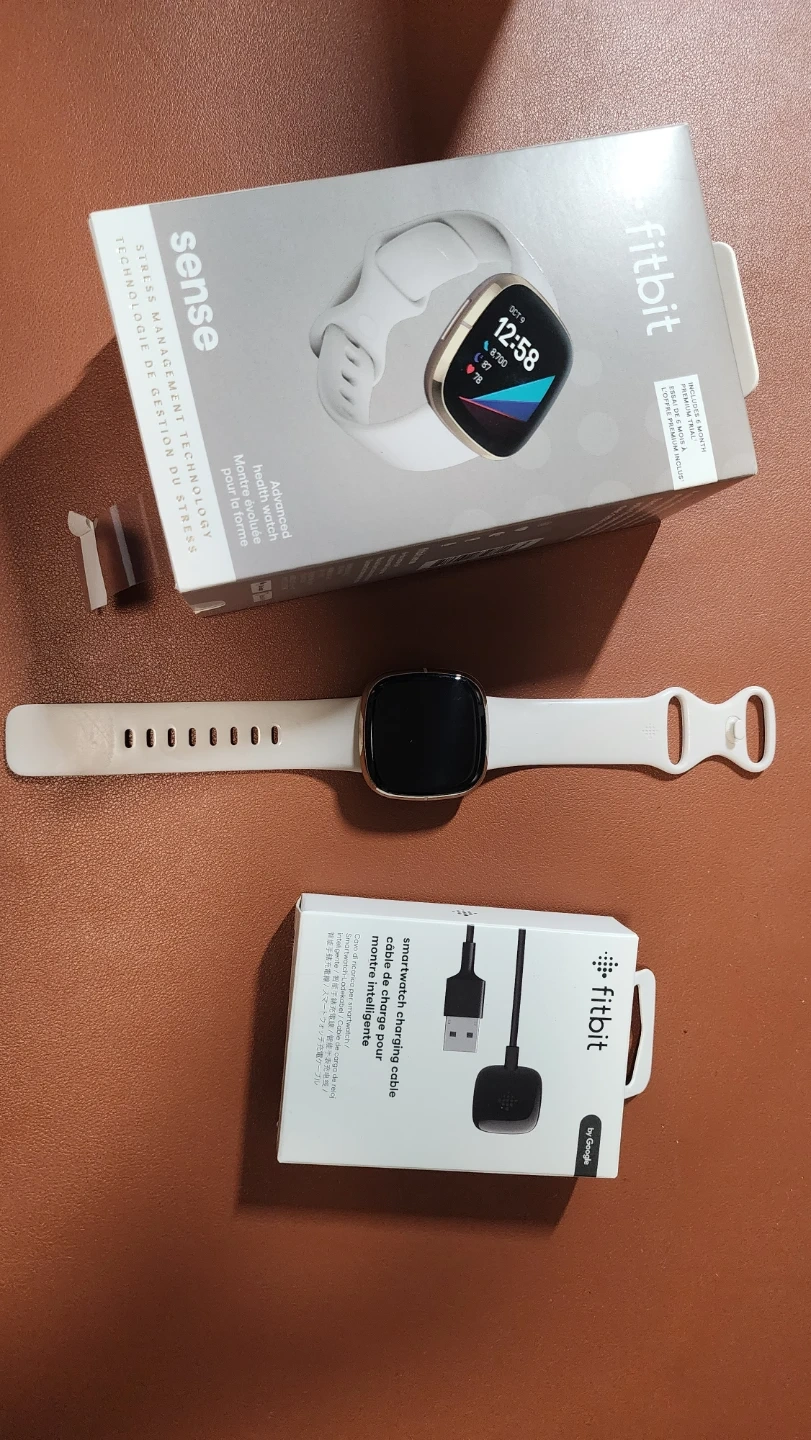 Selling a Fitbit Sense advanced smartwatch in soft gold and sand band. It comes with the box and charging cable. This smartwatch is designed to help you manage stress and monitor your health.