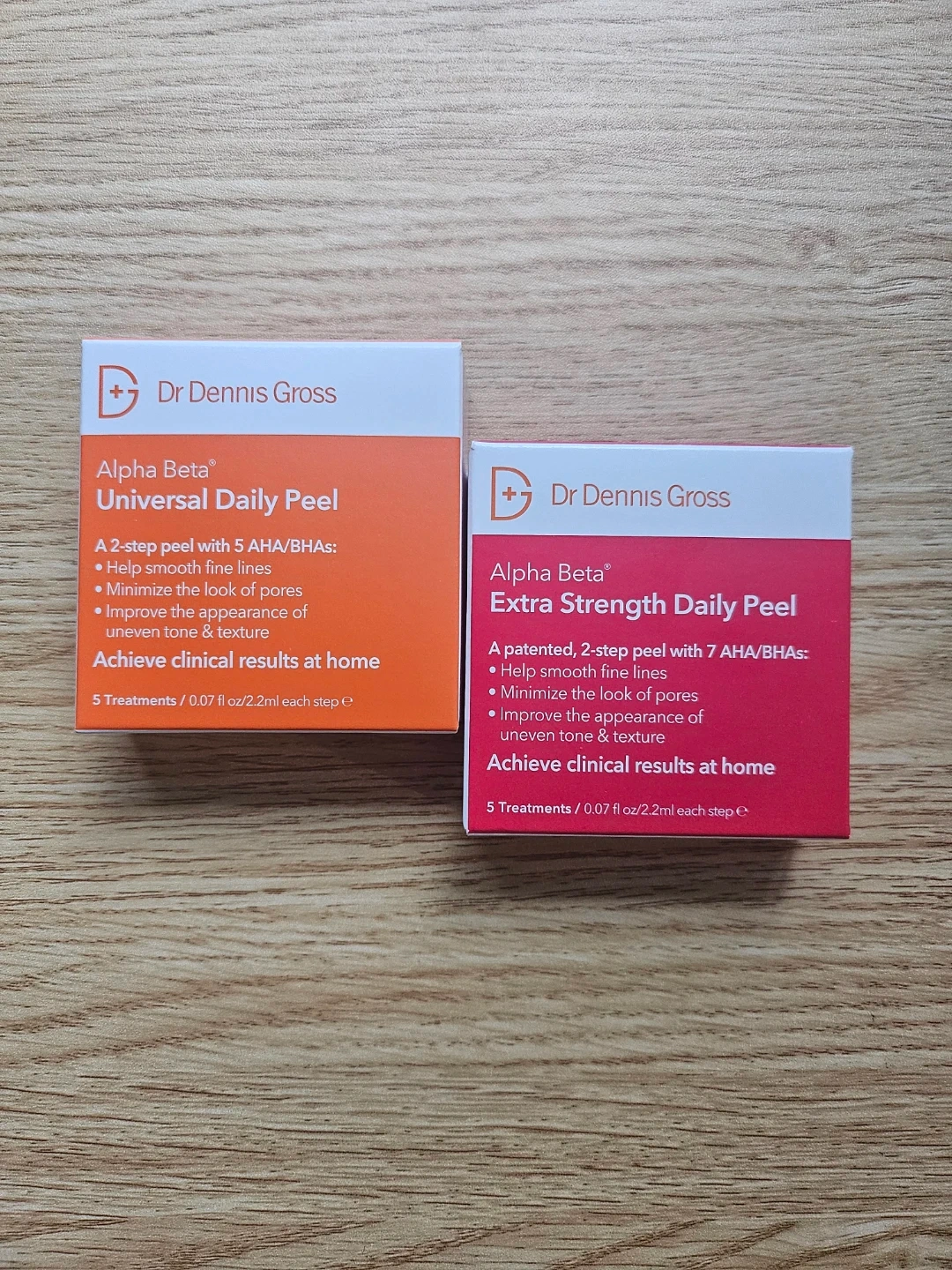Selling a set of Dr. Dennis Gross Alpha Beta daily peels! You'll get both the Universal Daily Peel (5 AHA/BHAs) and the Extra Strength Daily Peel (7 AHA/BHAs). Each box contains 5 treatments (0.07 fl oz/2.2ml each step). Achieve clinical results at home!