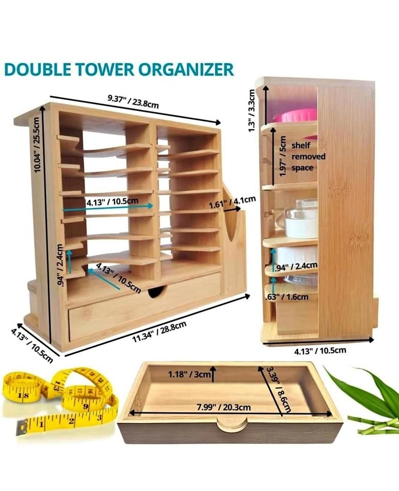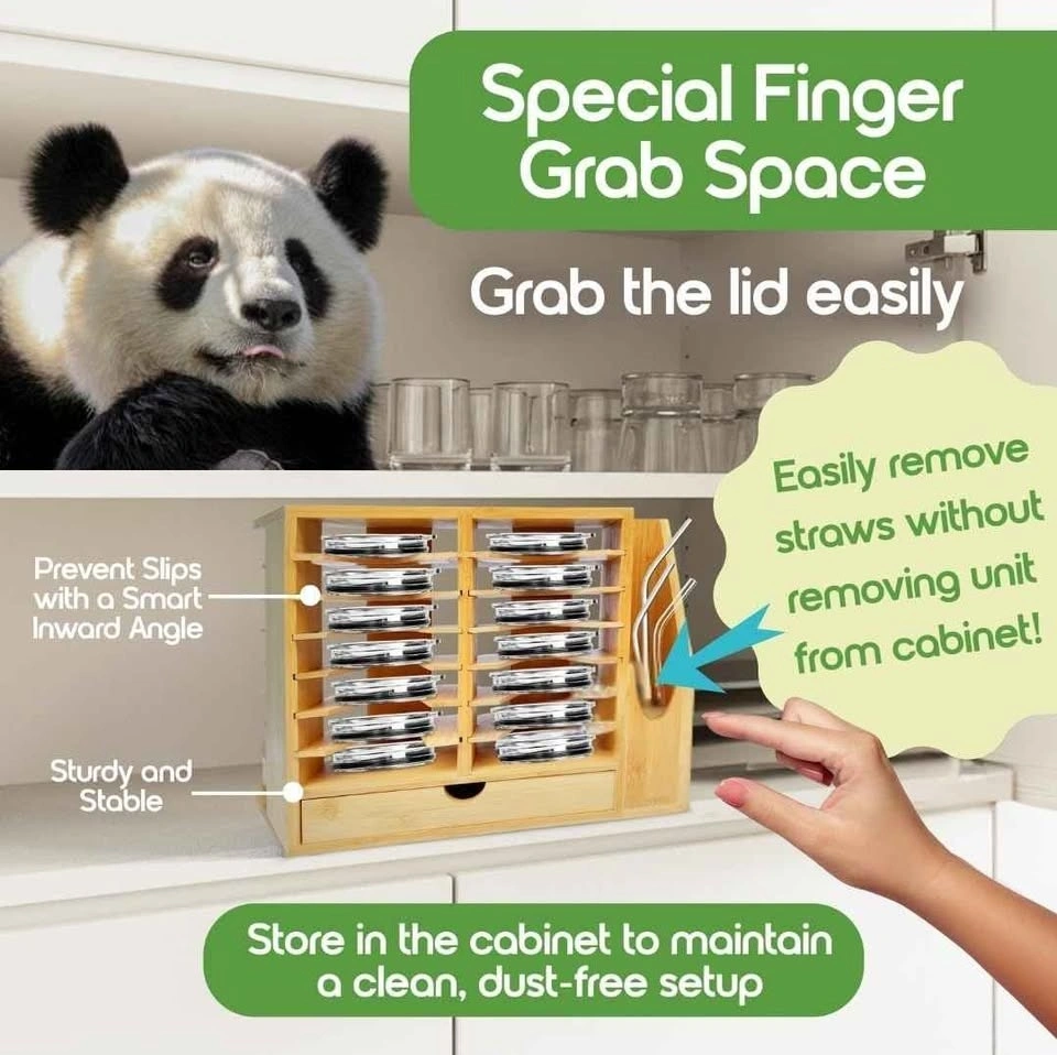 indyBe Bamboo Tumbler Lid Organizer – Space Saving Multi-Tier Storage Rack with Straw Holder and Gasket Drawer – Vertical Cup Lid Organizer for Cabinet, Kitchen Countertop - Double