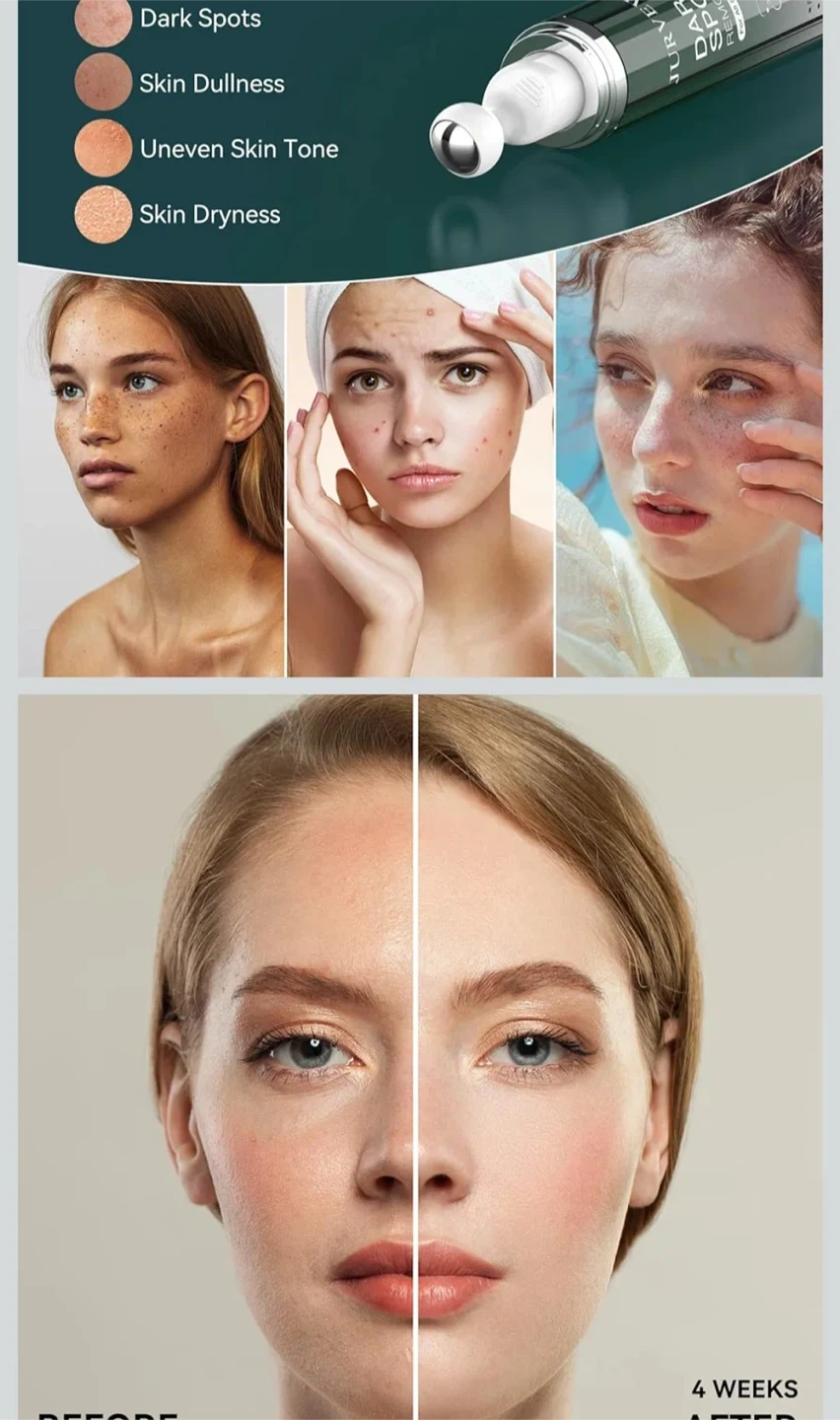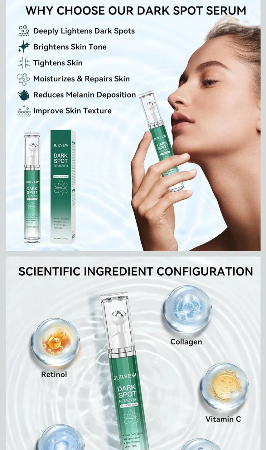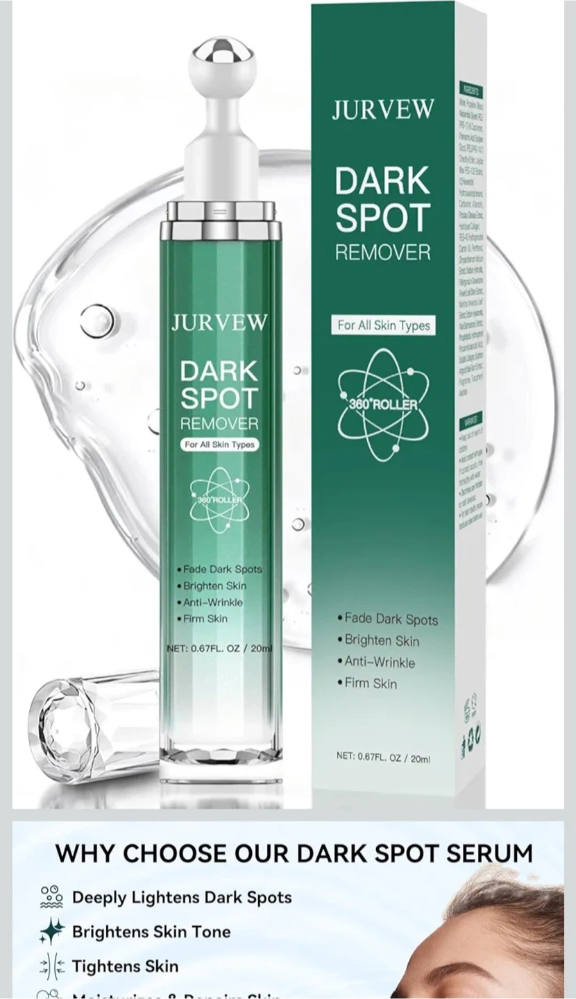 I'm selling a Jurvew Dark Spot Remover for all skin types. It features a 360° roller and is designed to fade dark spots, brighten skin, and act as an anti-wrinkle and firming agent. Net contents: 0.67FL. OZ / 20ml