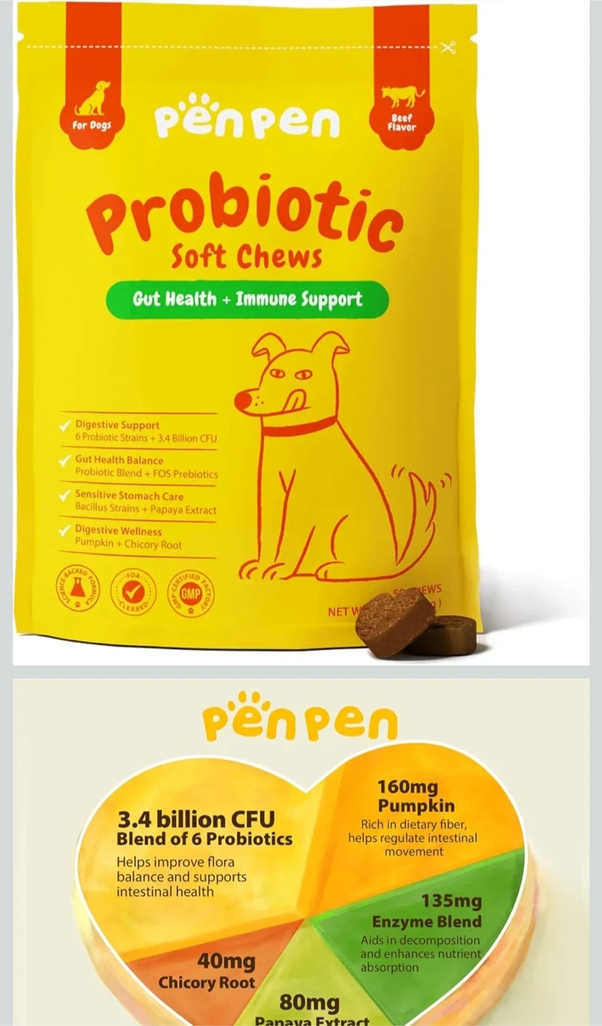 Got some PenPen Probiotic Soft Chews for dogs! These are beef flavored and great for gut health and immune support. They contain 3.4 billion CFU blend of 6 probiotics, pumpkin, enzyme blend, papaya extract, and chicory root. They're also 100% natural!