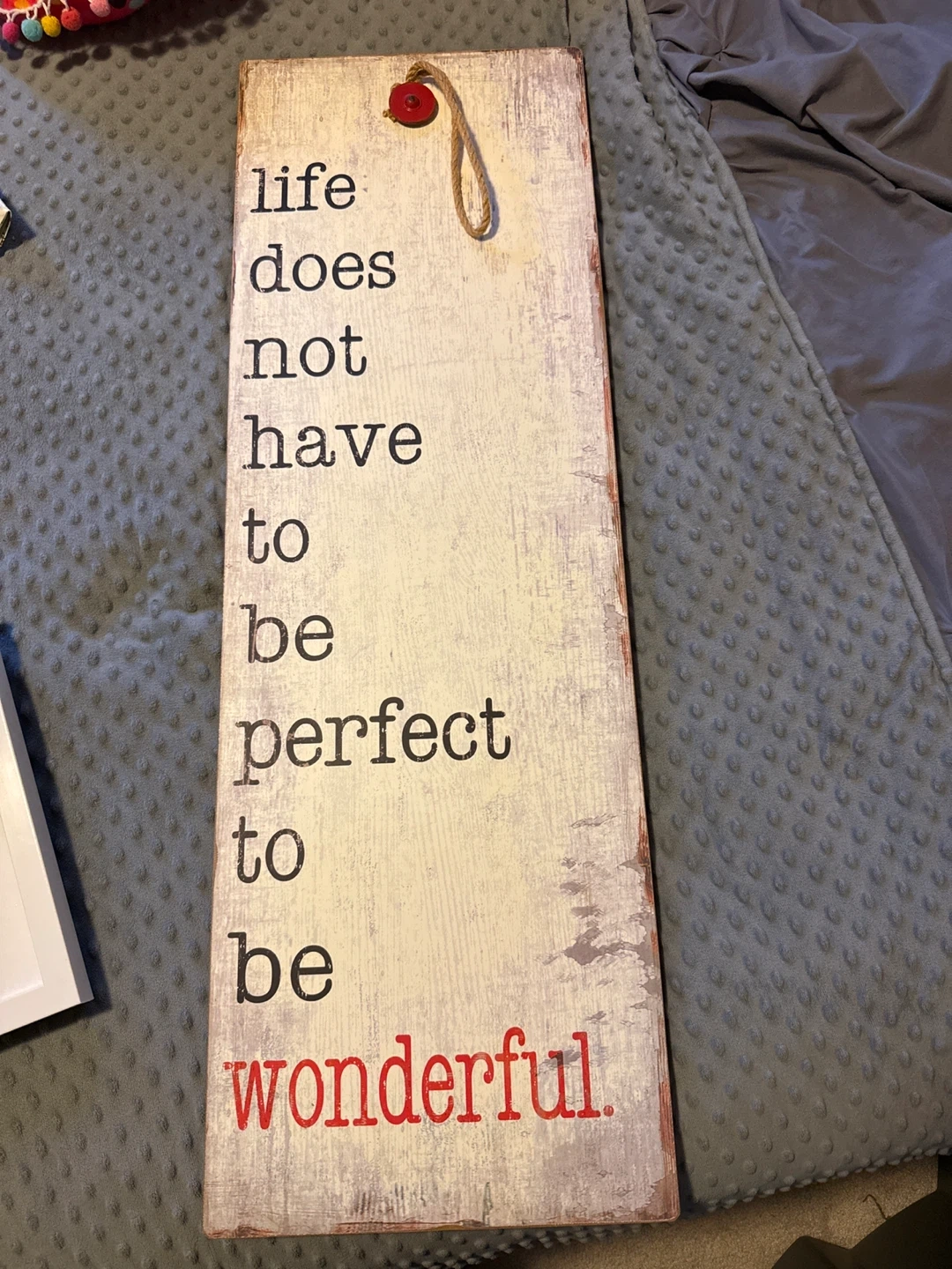 This wooden sign features the quote "Life does not have to be perfect to be wonderful" in black and red lettering. It's a charming piece of home decor that adds a touch of inspiration to any room!