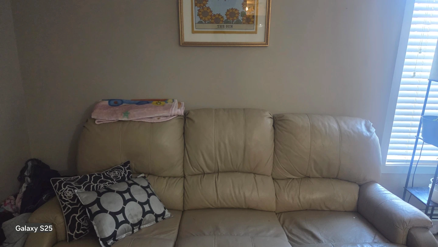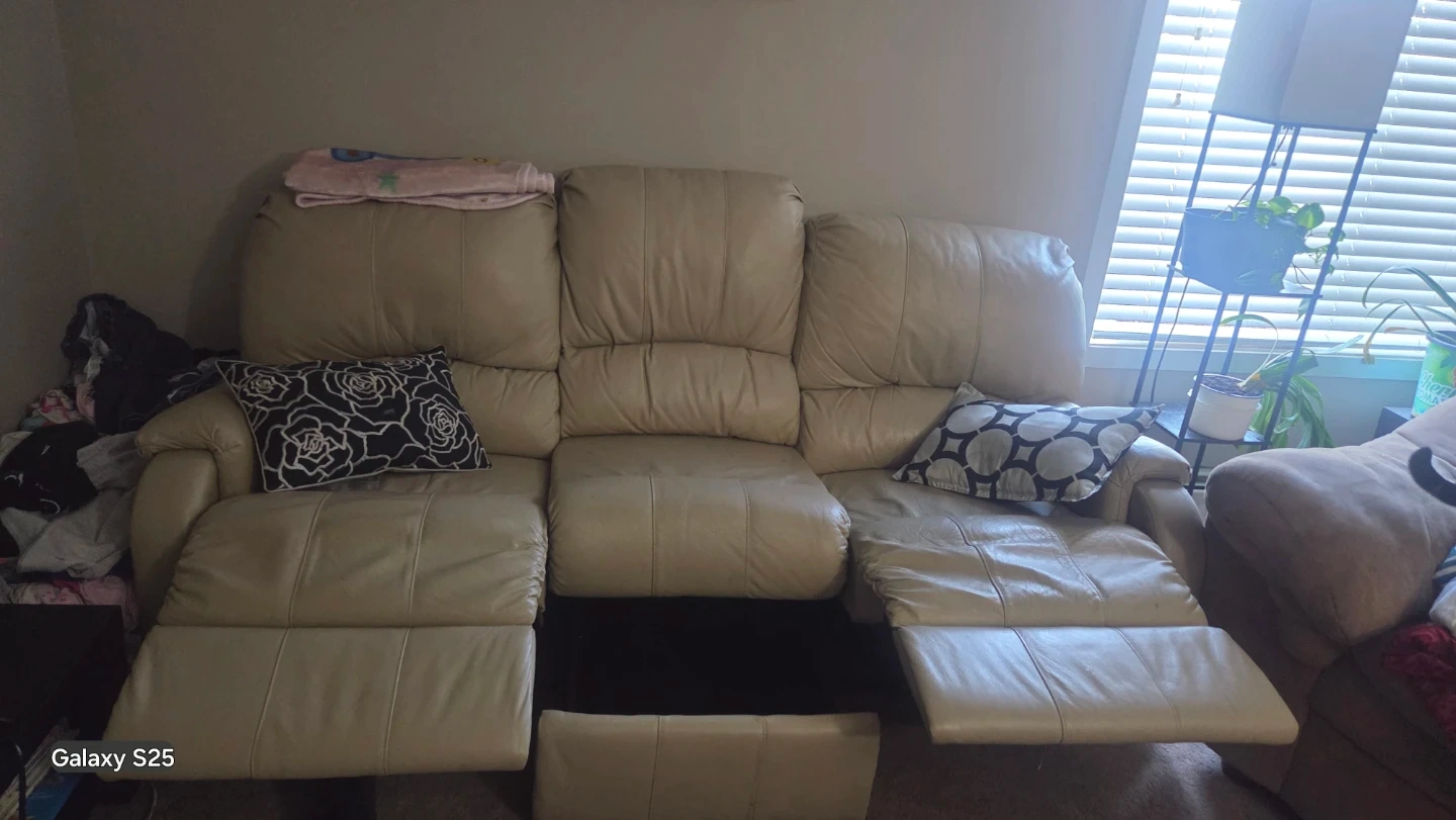 Selling a beige leather reclining sofa. It's a comfy three-seater with reclining features on each seat. Perfect for a living room or entertainment space to kick back and relax!