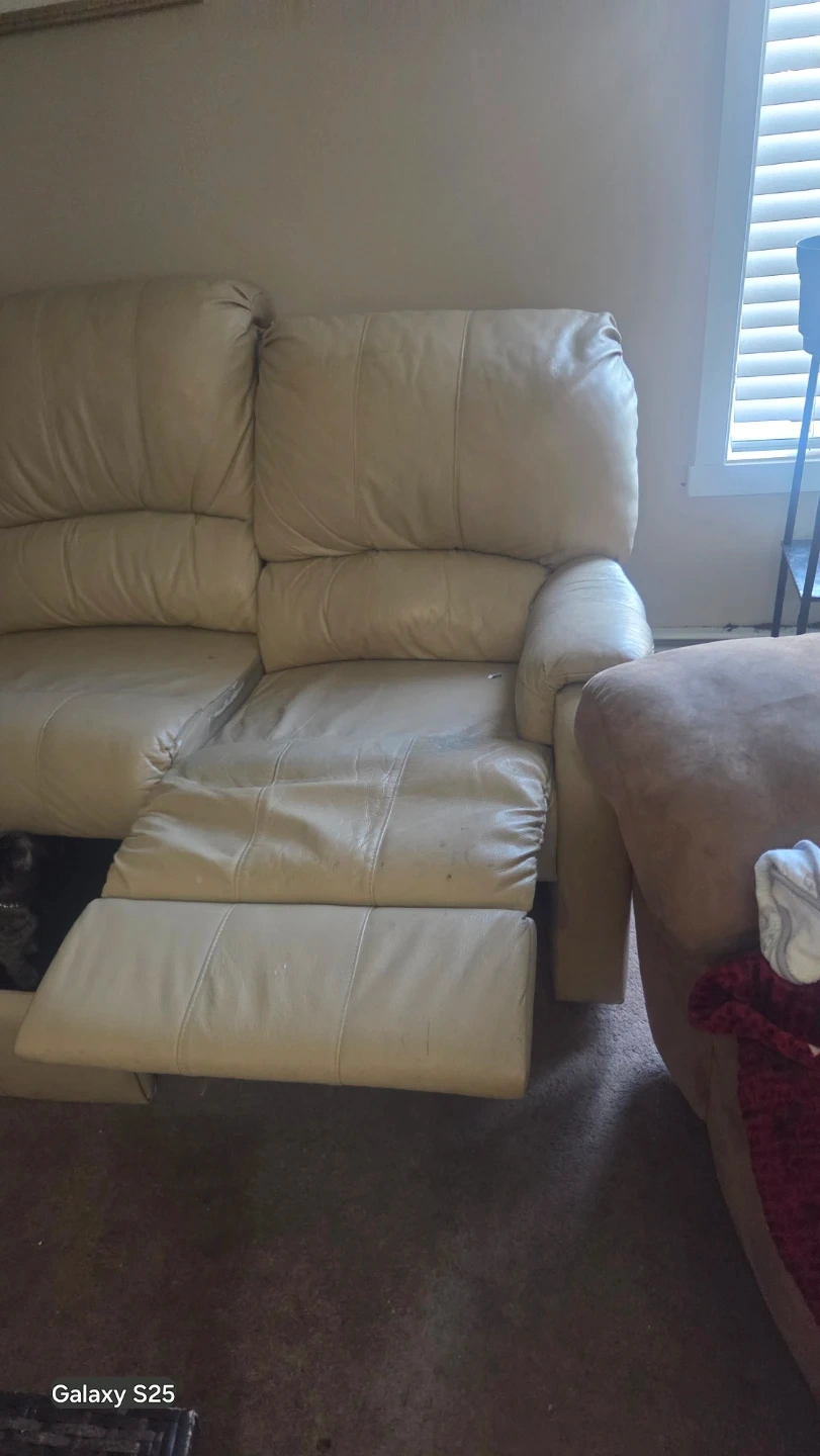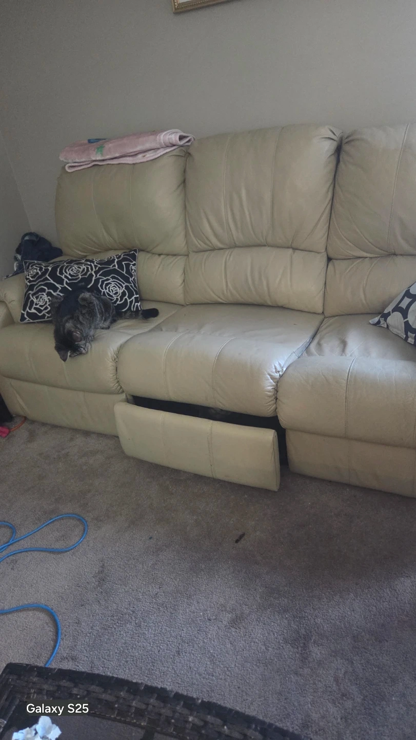 Selling a beige leather reclining sofa. It's a comfy three-seater with reclining features on each seat. Perfect for a living room or entertainment space to kick back and relax!
