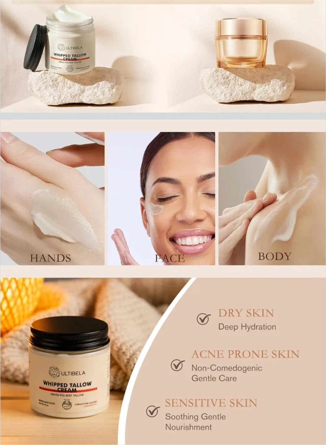 I'm selling Ultibela Whipped Tallow Cream! This cream is great for dry, acne-prone, and sensitive skin. It provides deep hydration, non-comedogenic gentle care, and soothing gentle nourishment. It's a repair moisturizer with a net weight of 4 fl oz. Strength for your skin, and it's unscented