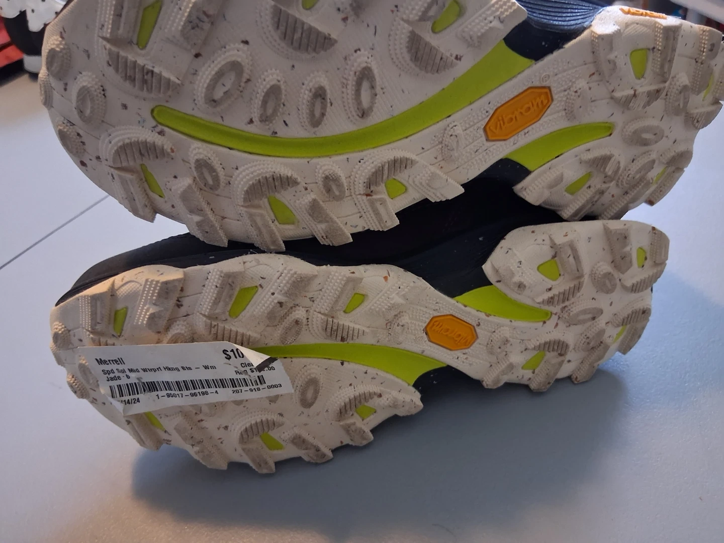 These are Merrell Speed Solo Mid Waterproof Hiking Boots in Jade, size 6. They are a certified Bloom clean water + clean air product. They feature a Vibram sole. Originally