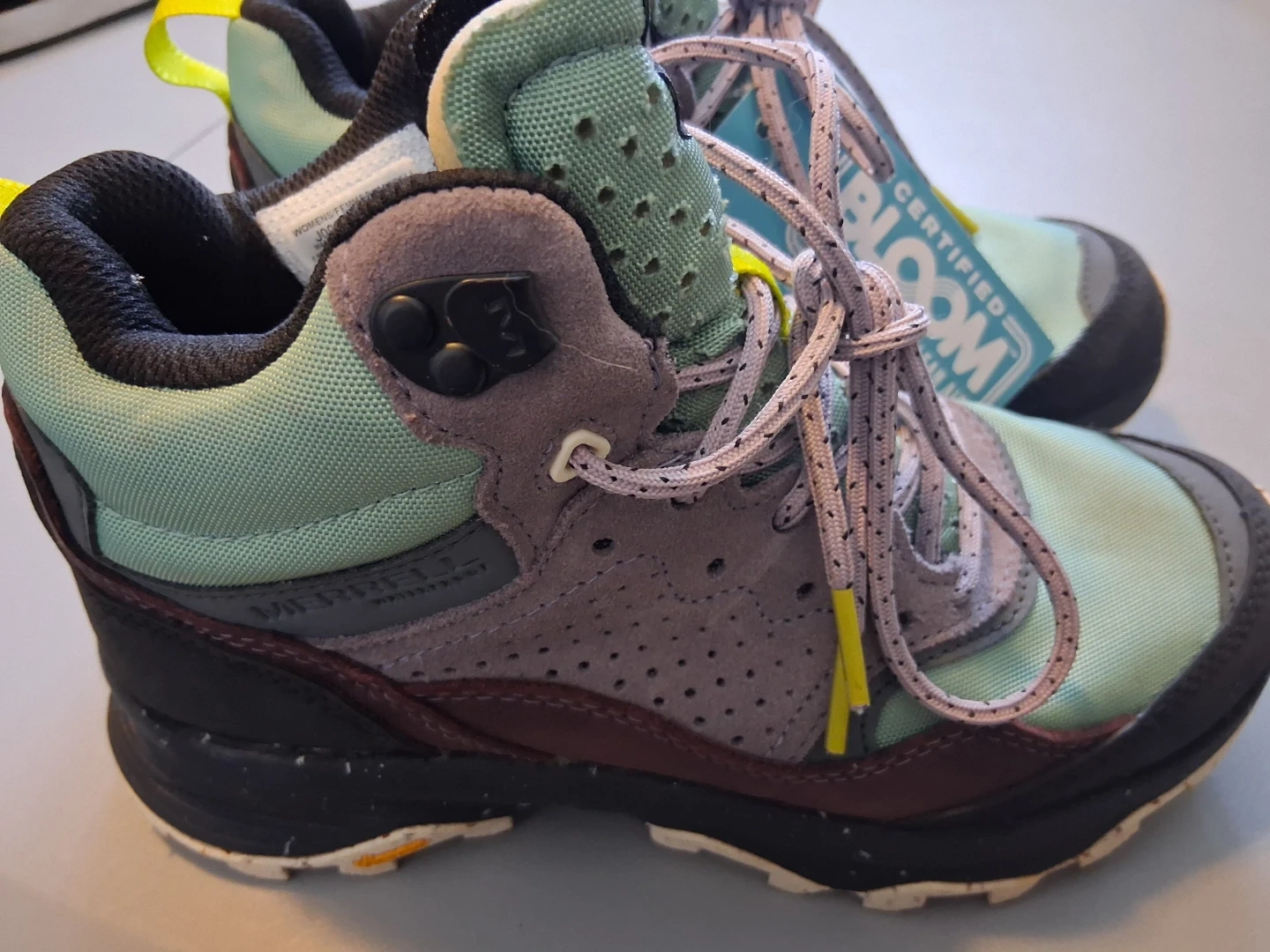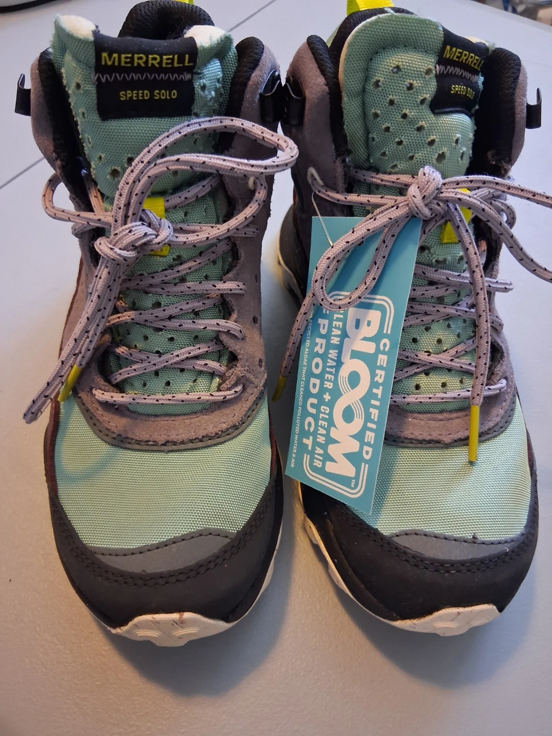 These are Merrell Speed Solo Mid Waterproof Hiking Boots in Jade, size 6. They are a certified Bloom clean water + clean air product. They feature a Vibram sole. Originally