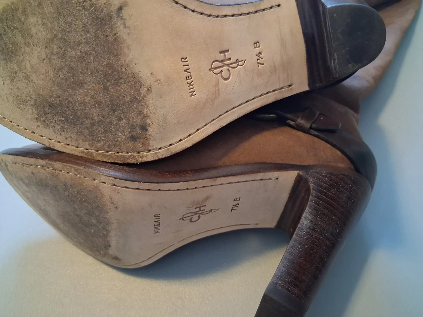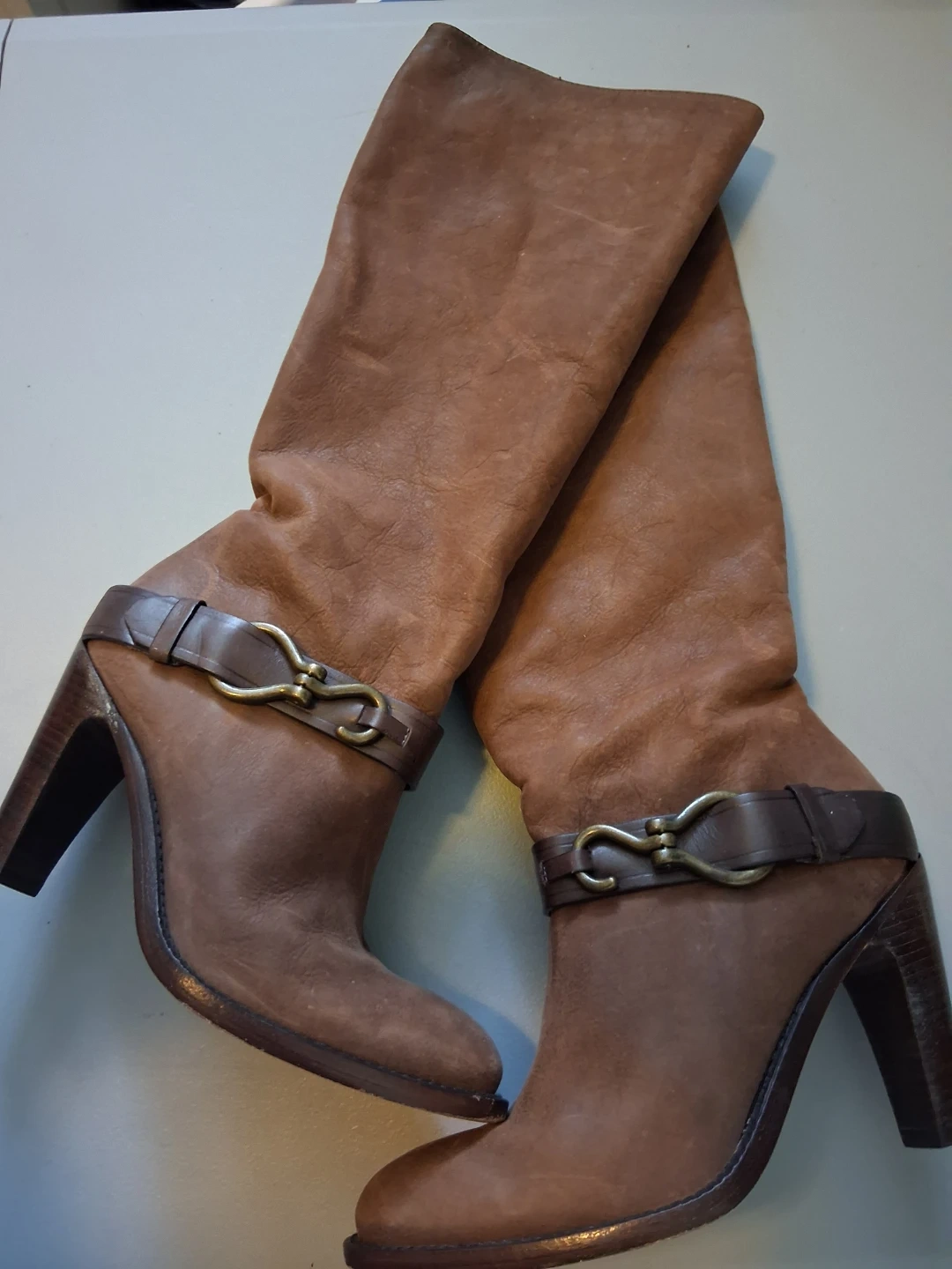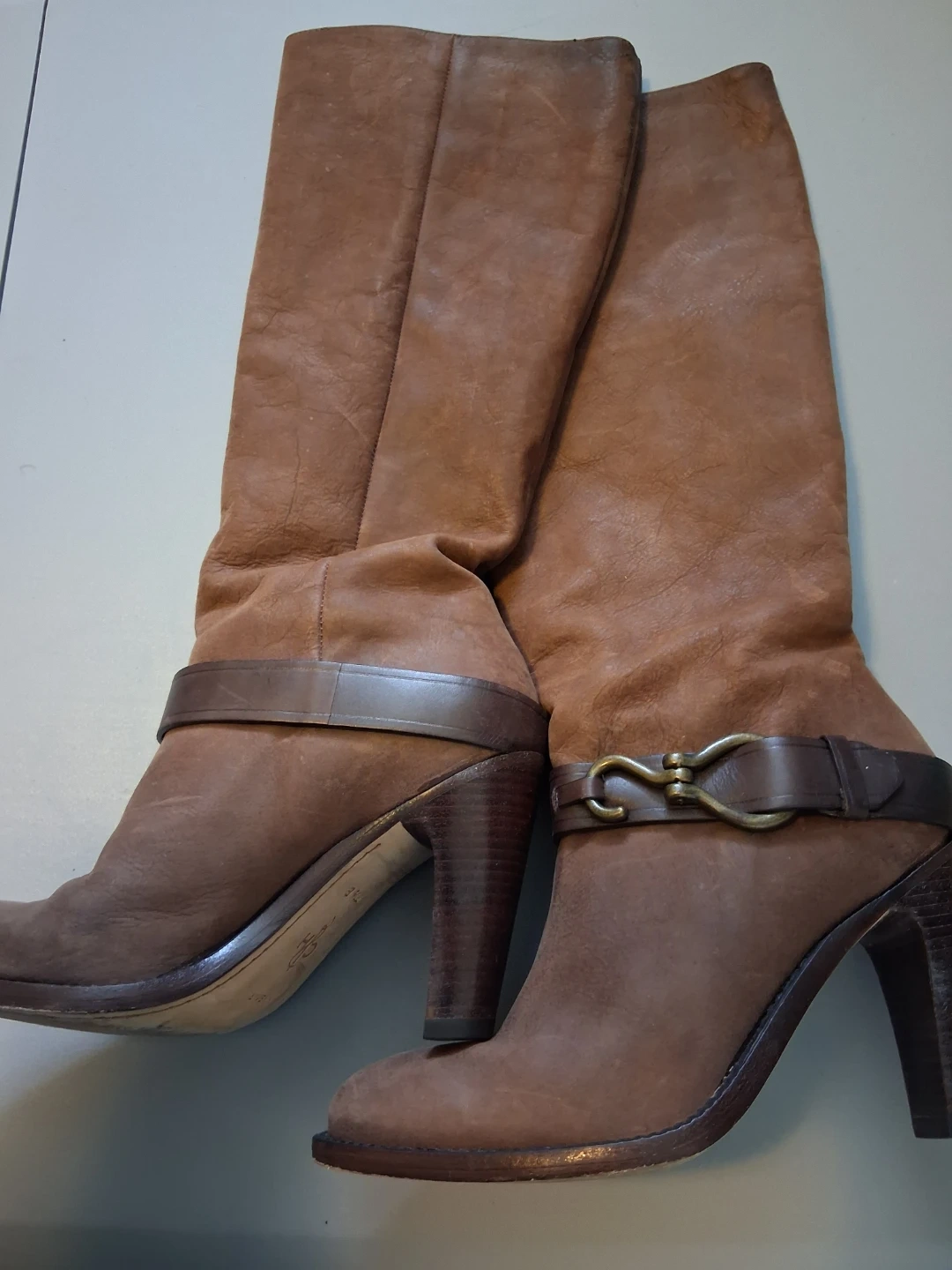 Selling a pair of Cole Haan brown leather boots. They are a size 7.5 B and feature a stylish buckle detail. The boots have a leather upper and a comfortable heel. Perfect for adding a touch of elegance to any outfit!