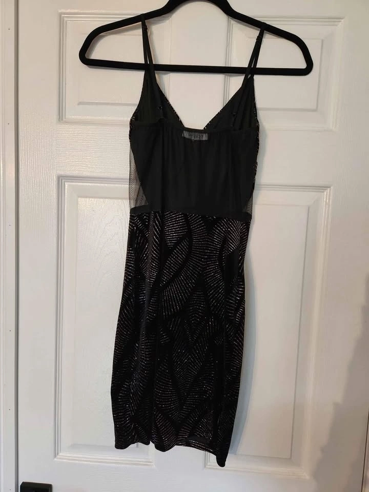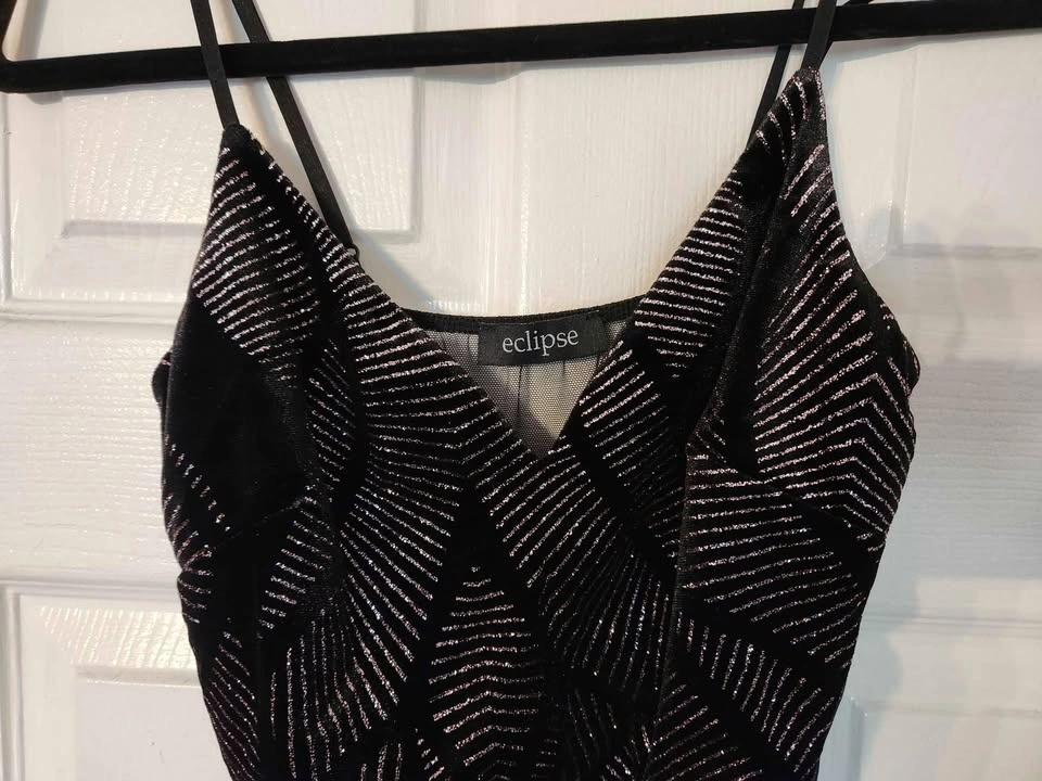 Never worn. Beautiful, Eclipse brand, size Small. Sheer across the top in the back and sides. Fitted. Adjustable straps adjust length of dress from 32-36.5". Would be a gorgeous dress to wear for a night out, NYE party, etc.