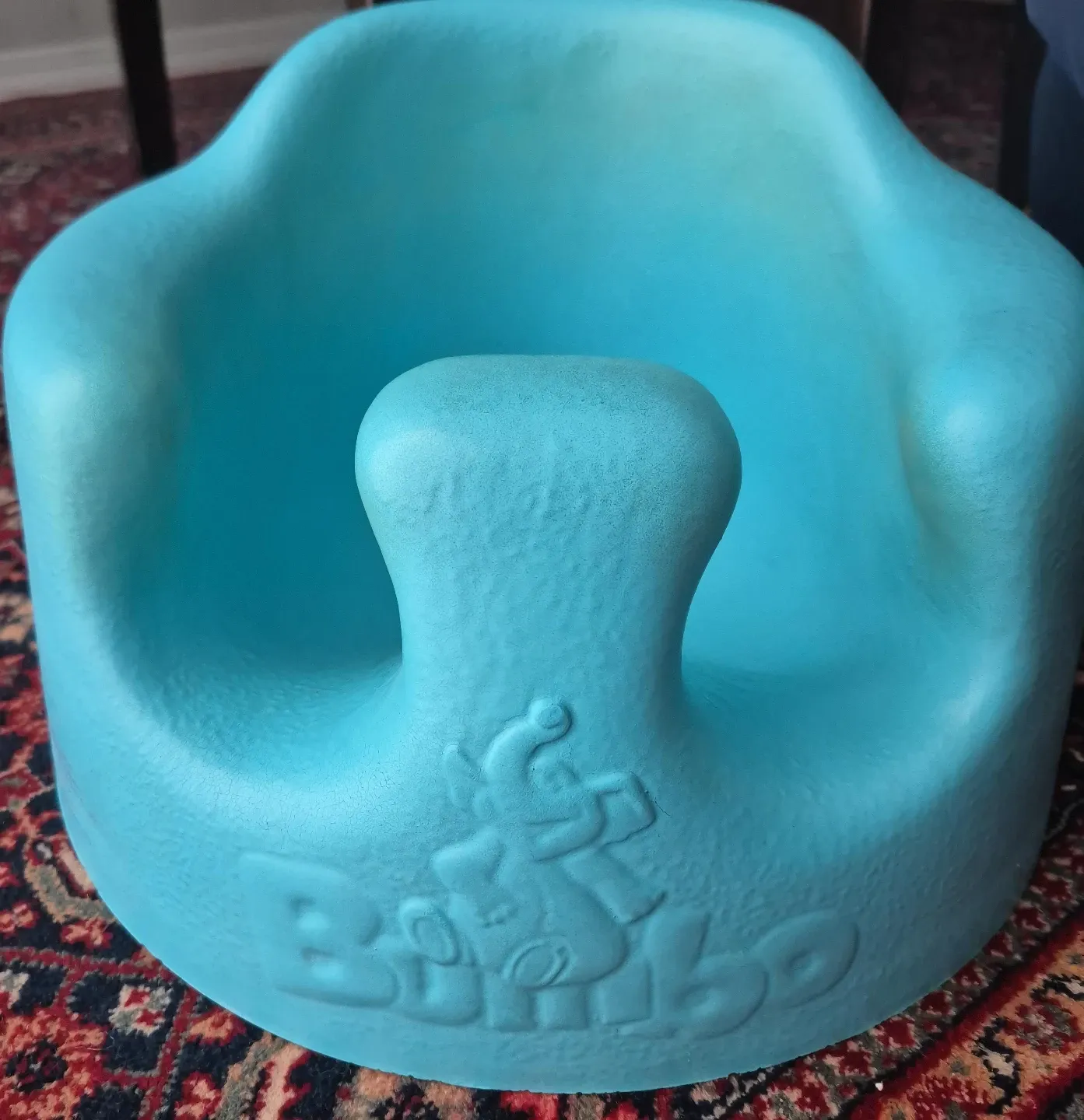 a Bumbo floor seat in aqua blue. It's in good condition and perfect for helping your little one sit up and explore their surroundings!
