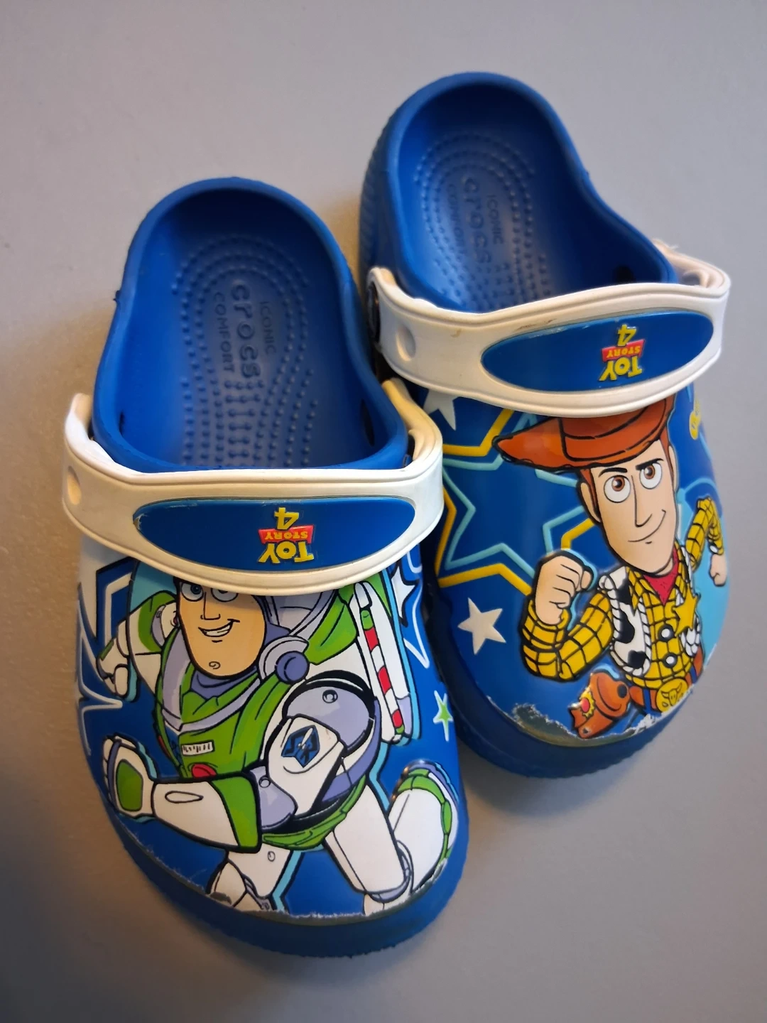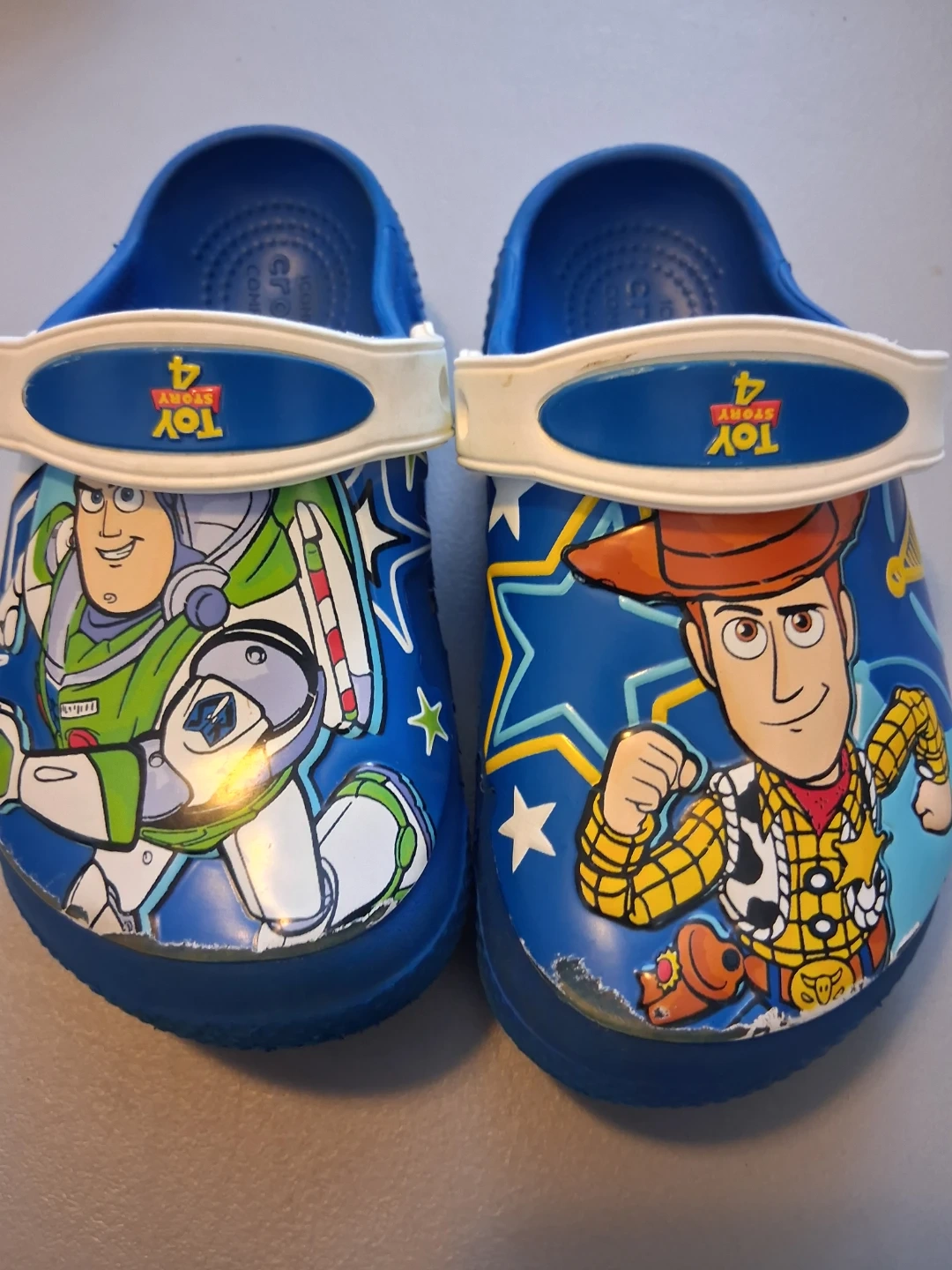 These are a pair of blue Crocs clogs featuring Toy Story 4 characters, including Woody and Buzz Lightyear! They are size 11 and show some signs of wear, as pictured