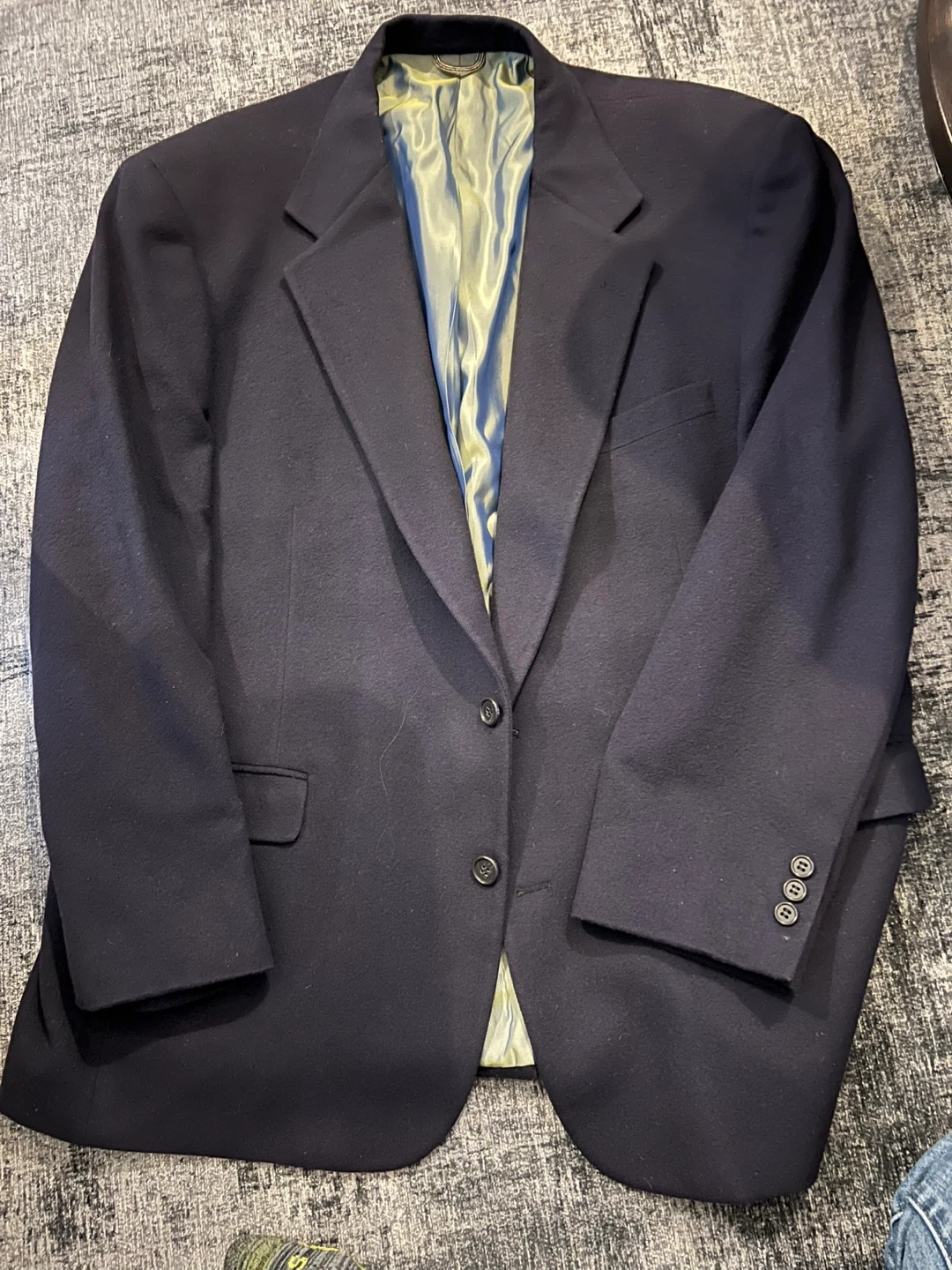 1. Navy cashmere single breasted jacket from Hastings. Glorious iridescent lining. Made in USA.