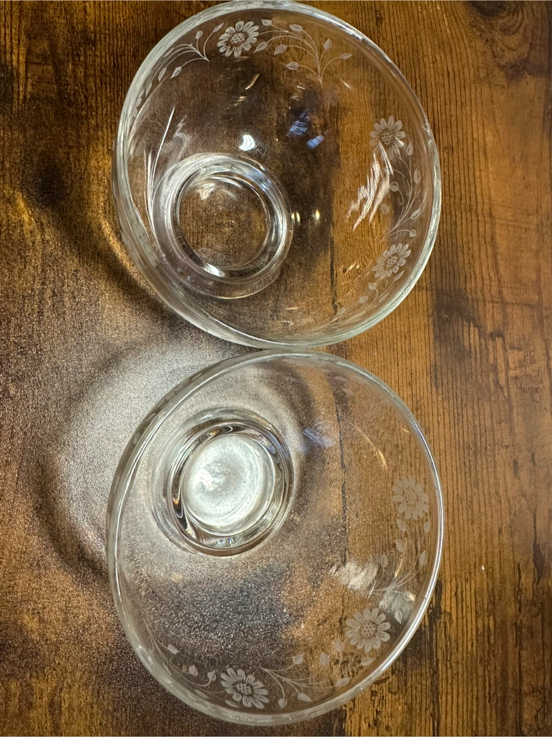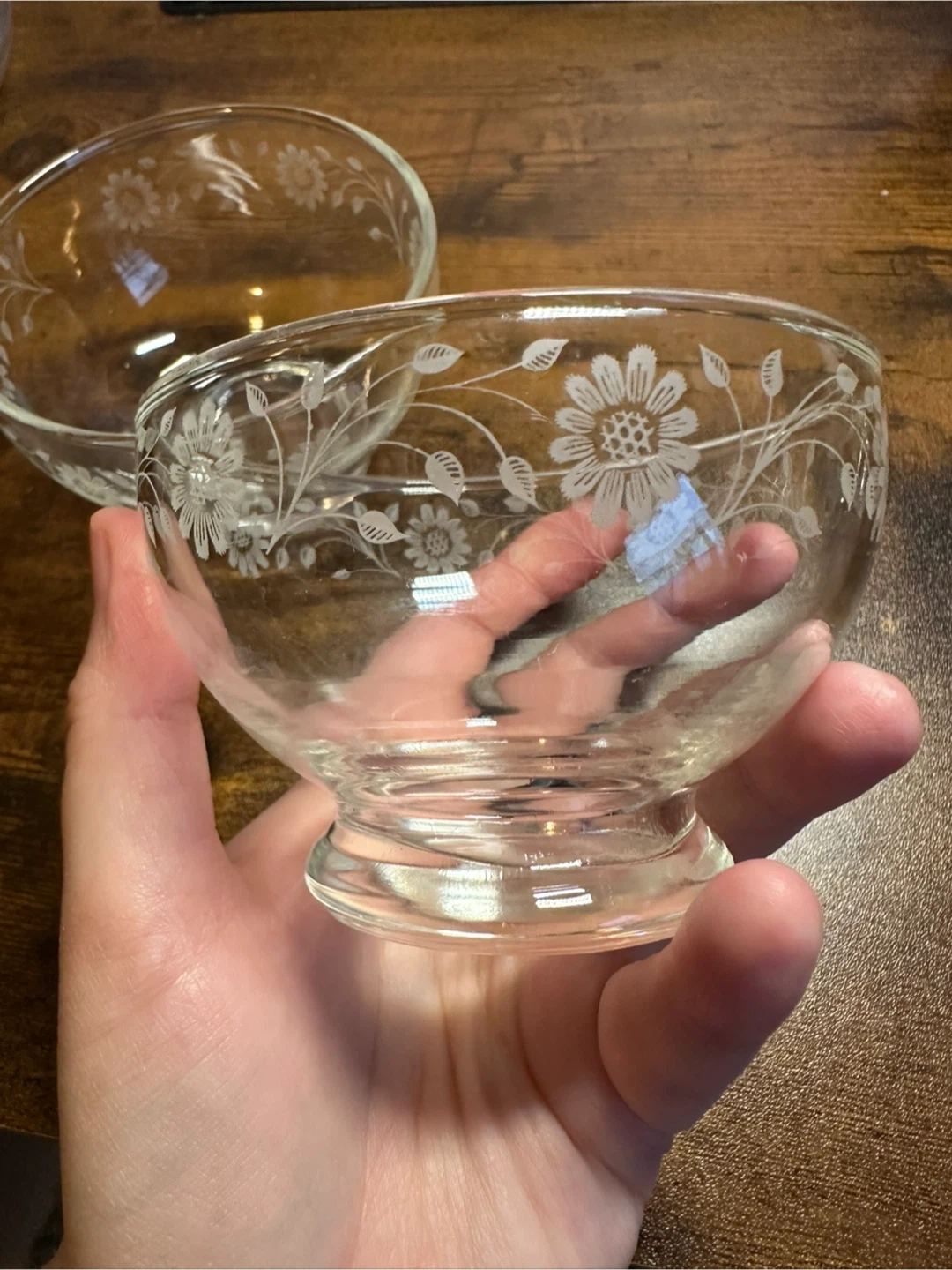 Selling a set of two delicate glass dessert bowls. They feature a beautiful floral etching design. Perfect for serving desserts or small snacks. They are in great condition!