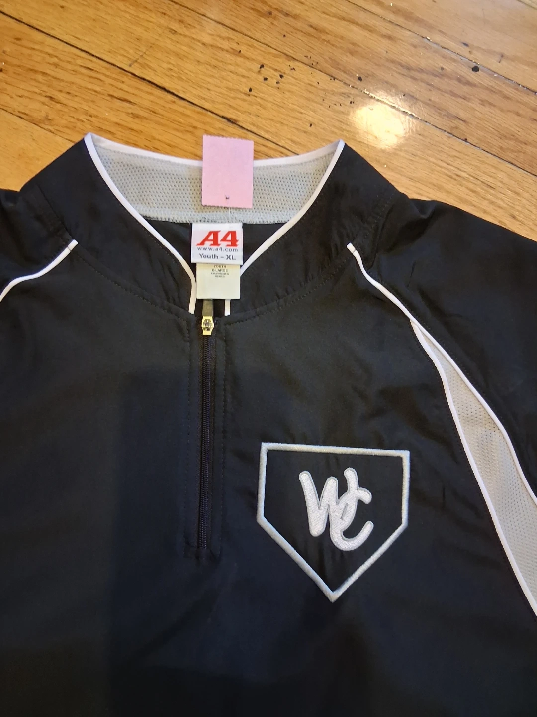 Selling an A4 brand youth baseball pullover jacket in size XL. It's black with white accents and features a quarter-zip design. Perfect for staying warm during practices or games!