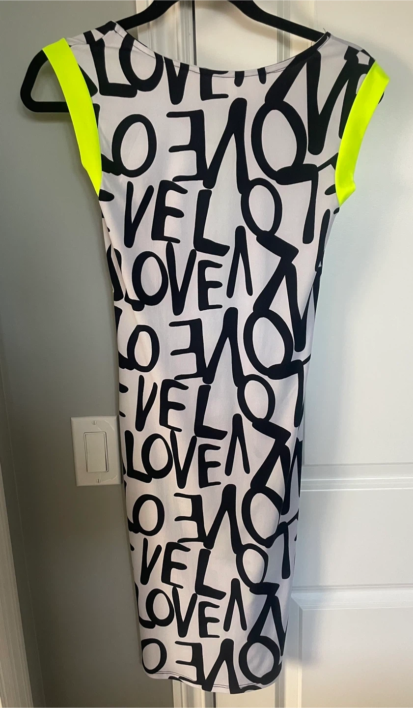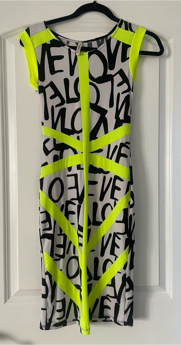 Stylish Pinklicious dress featuring a bold black and white print with eye-catching neon yellow accents! Perfect for making a statement and adding a pop of colour to your wardrobe. Size small