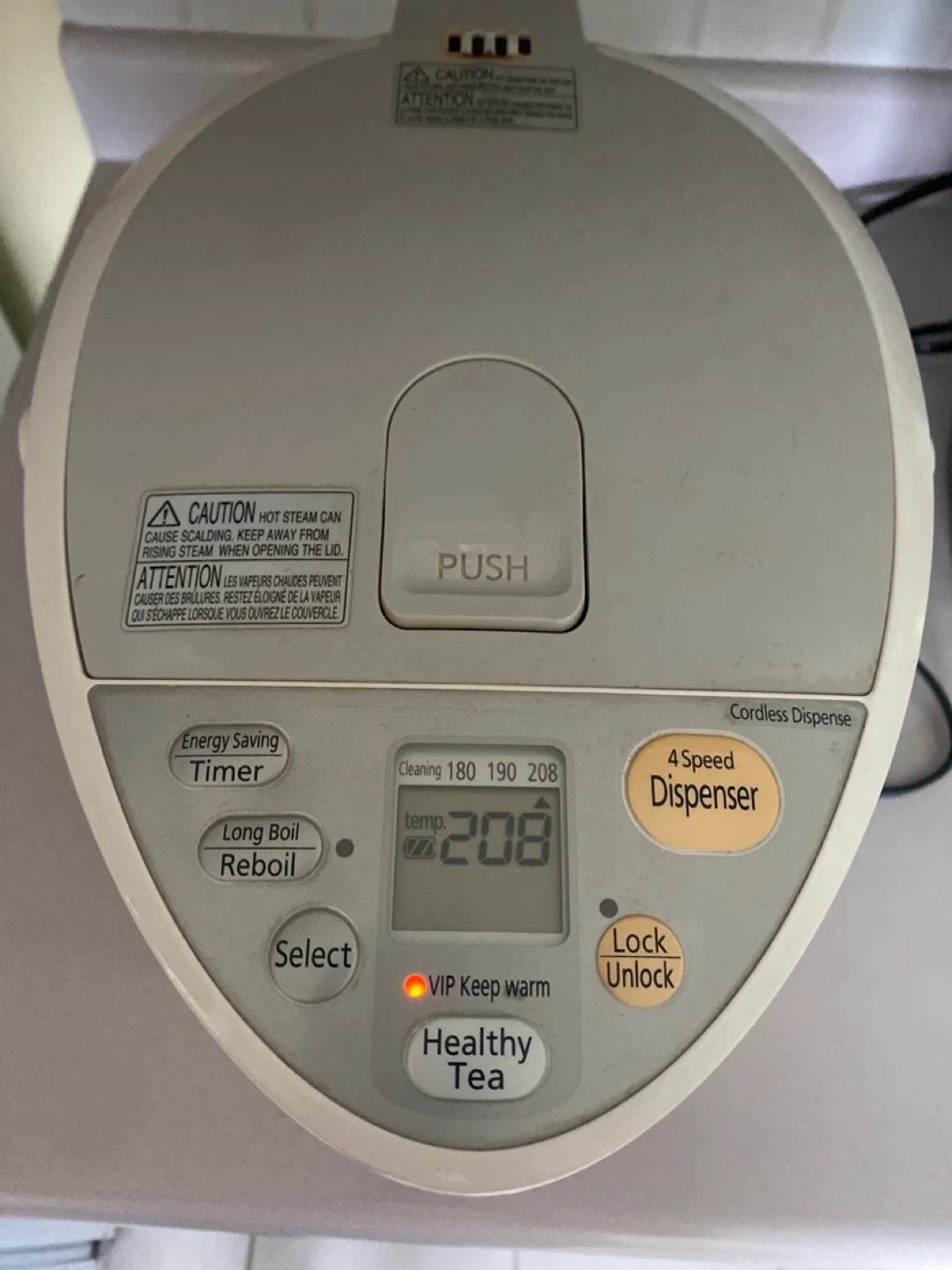 Selling a Panasonic VIP NC-HU301P electric water boiler with a 3.0L capacity. It features a 4-speed dispenser, energy-saving timer, and a long boil/reboil function. It also has a VIP keep warm setting and a healthy tea option