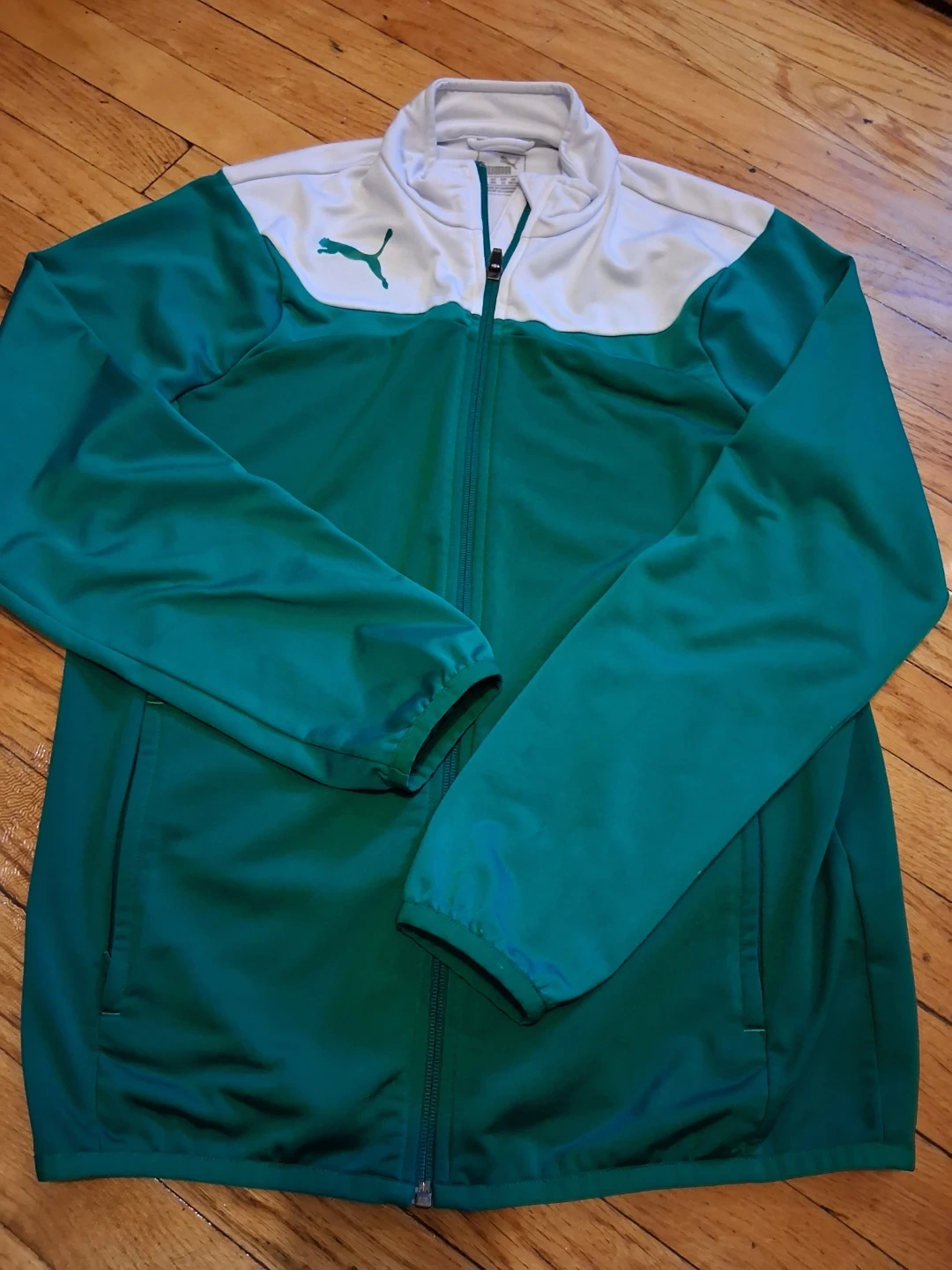 Selling a Puma track jacket in green and white. It's in great condition and perfect for workouts or casual wear