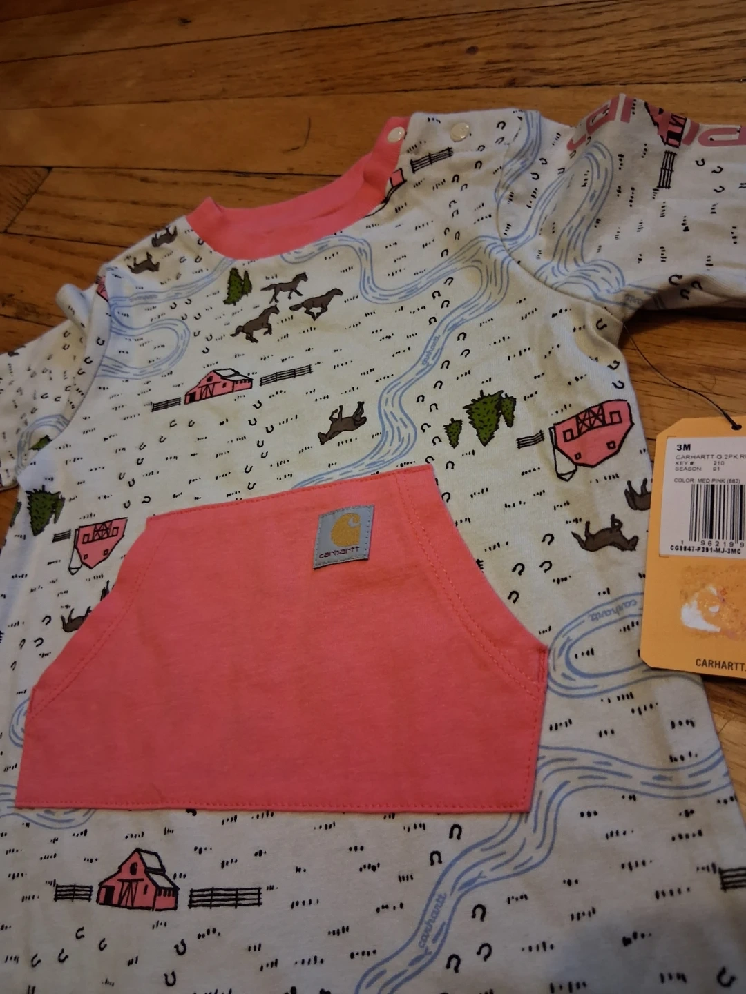 This Carhartt baby romper is brand new with tags! It's a size 3M and features a cute farm-themed print with a medium pink pocket and trim. Originally bought for $39.99