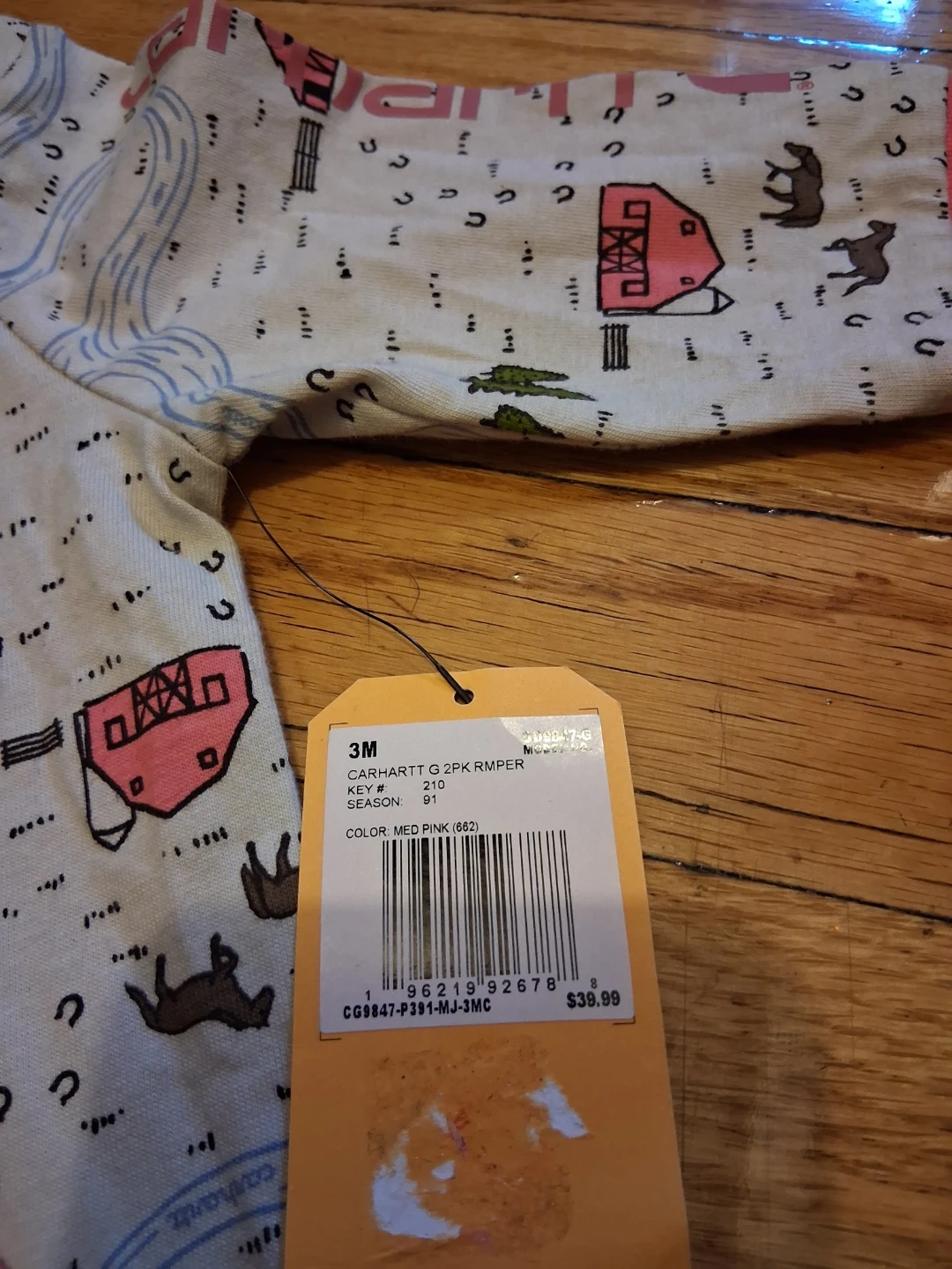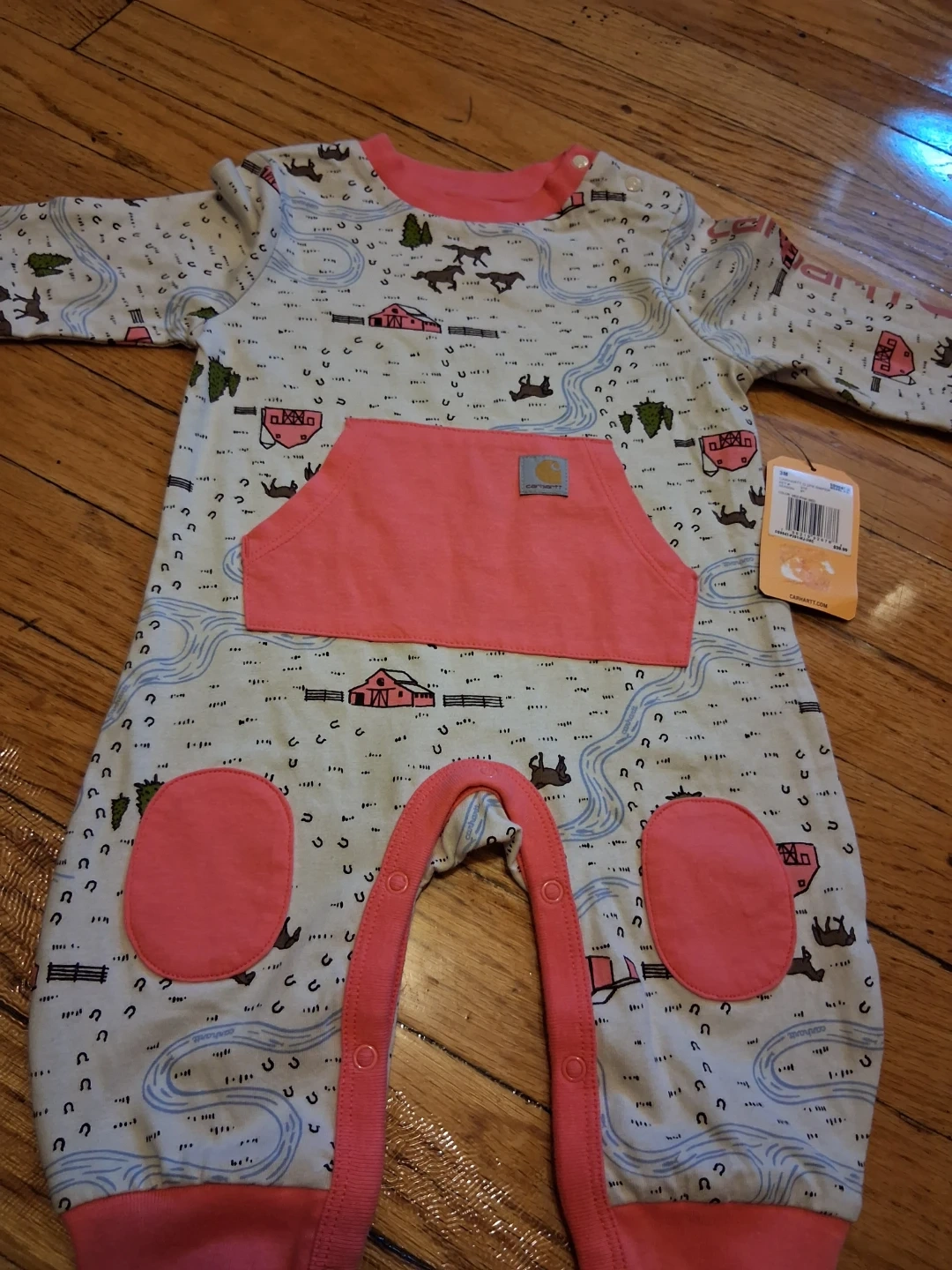 This Carhartt baby romper is brand new with tags! It's a size 3M and features a cute farm-themed print with a medium pink pocket and trim. Originally bought for $39.99