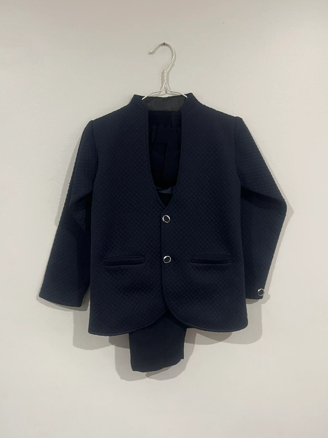 Selling a boy's navy blue suit, perfect for special occasions! Includes a jacket, vest, and pants. The jacket measures approximately 19.5 inches in length and 14.5 inches across. The pants have a length of about 23.5 inches. A stylish and complete outfit for your little one.