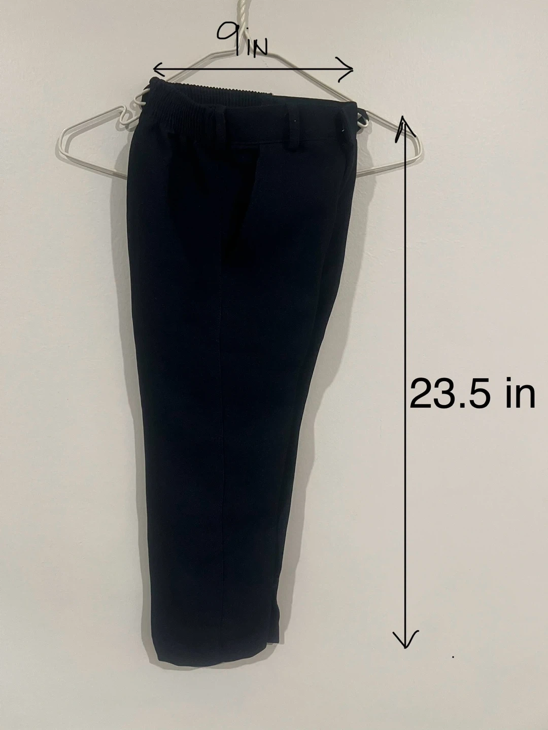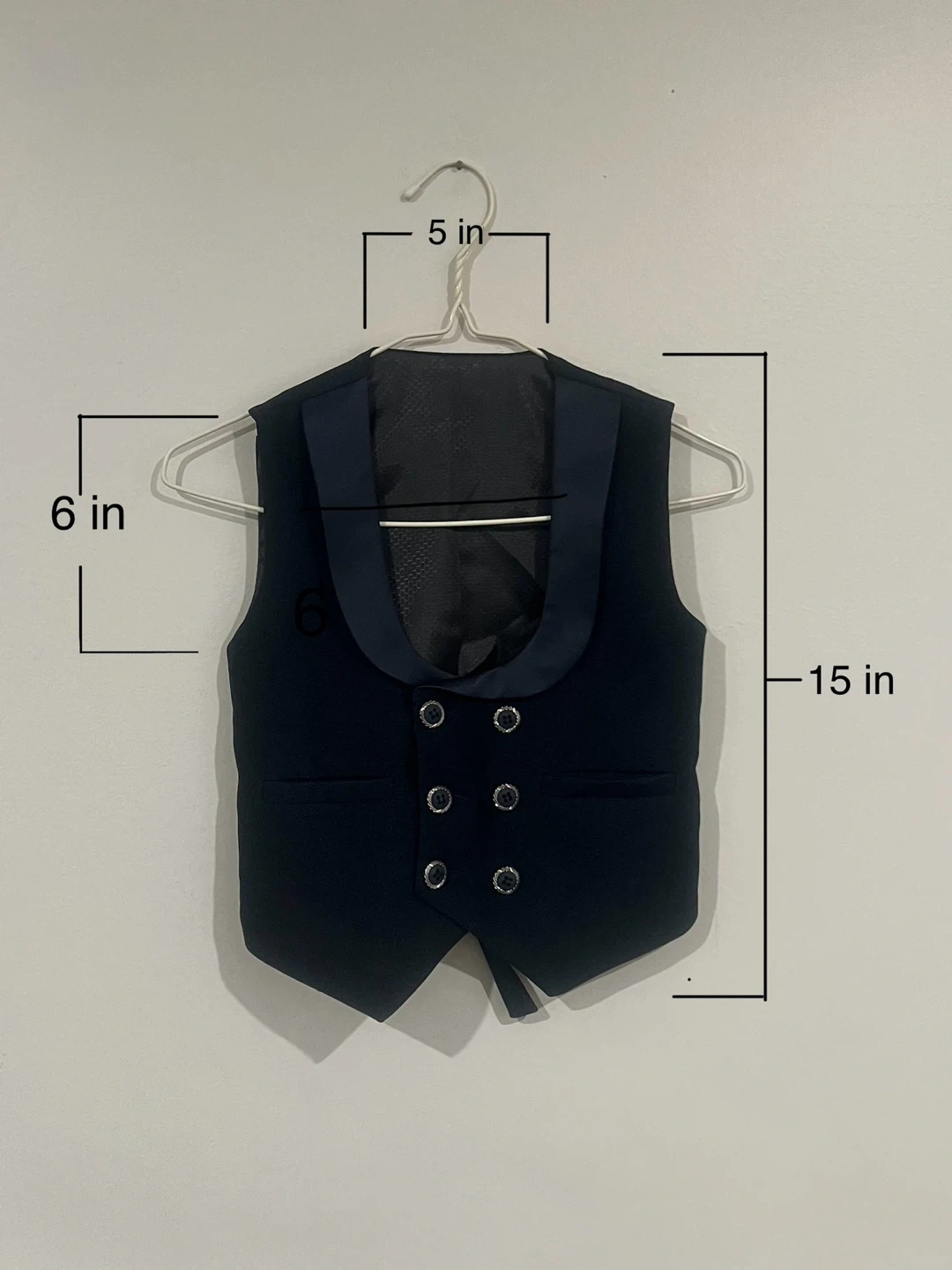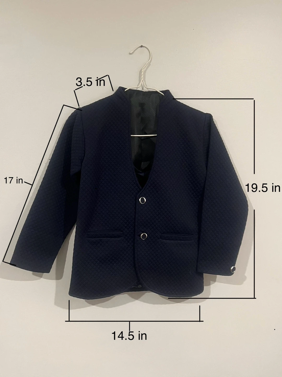 Selling a boy's navy blue suit, perfect for special occasions! Includes a jacket, vest, and pants. The jacket measures approximately 19.5 inches in length and 14.5 inches across. The pants have a length of about 23.5 inches. A stylish and complete outfit for your little one.