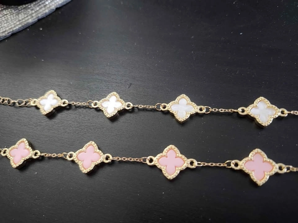Beautiful gold-tone clover charm bracelets available in soft pink and classic white.