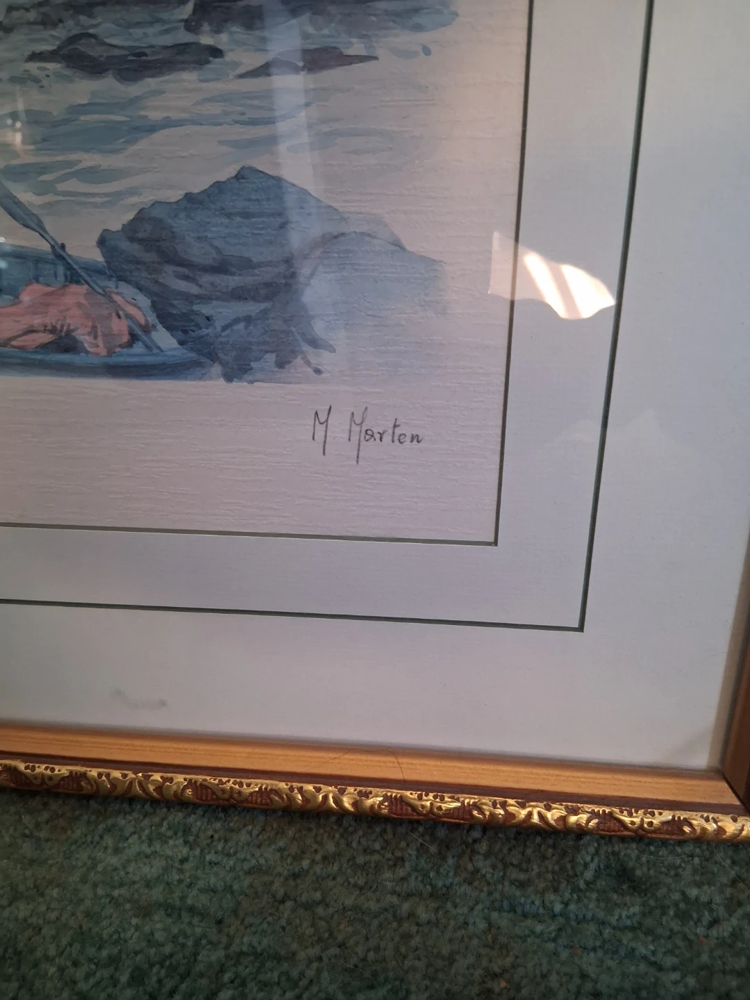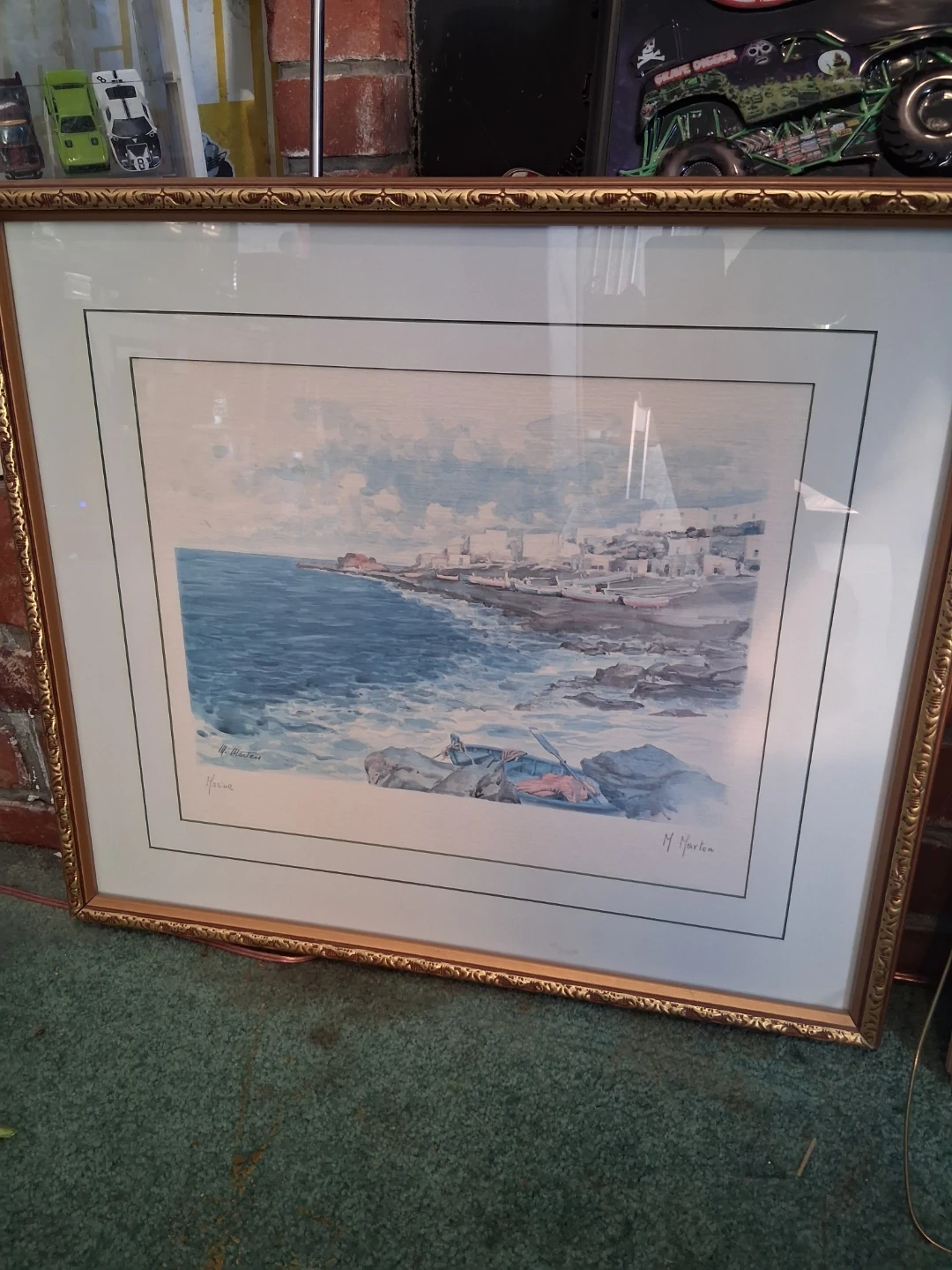 A lovely framed print titled "Marina" by the artist M. Marten. It depicts a serene coastal scene with calming blues and whites. The frame is ornate and adds a touch of elegance to the piece. Perfect for adding a touch of seaside charm to any room!