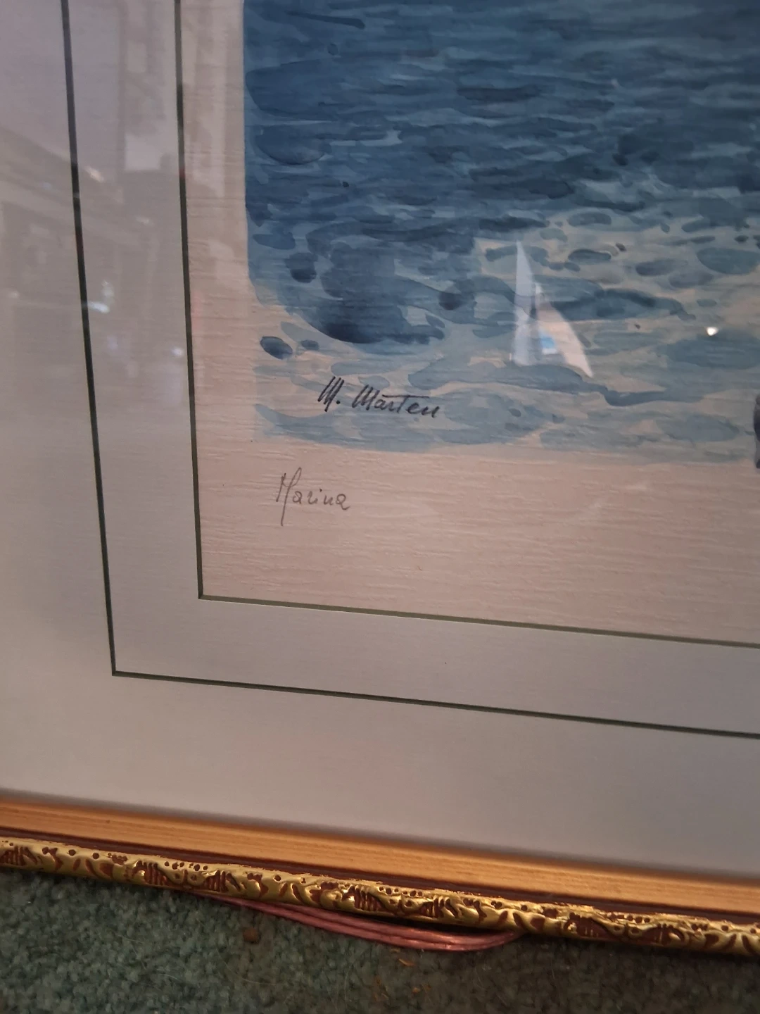 A lovely framed print titled "Marina" by the artist M. Marten. It depicts a serene coastal scene with calming blues and whites. The frame is ornate and adds a touch of elegance to the piece. Perfect for adding a touch of seaside charm to any room!