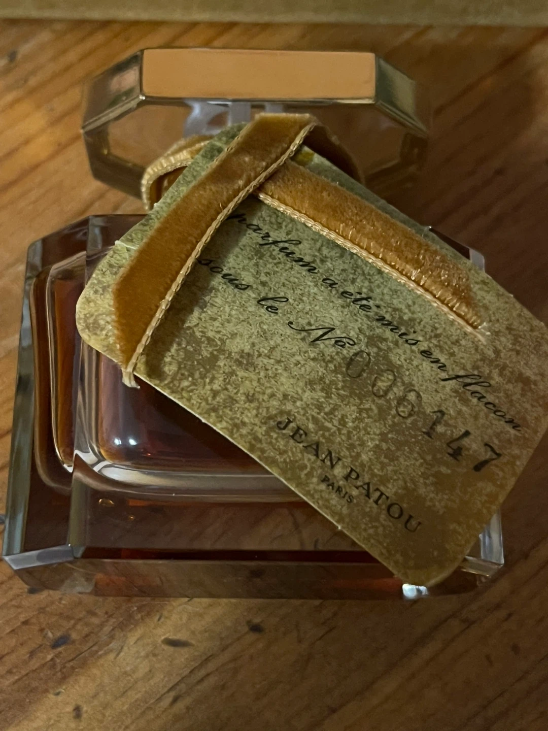 The perfume come with the original tag still attached, with the number #006147. The tag however has been damaged by moisture (it’s intact, just has markings on it as you can see in the picture.