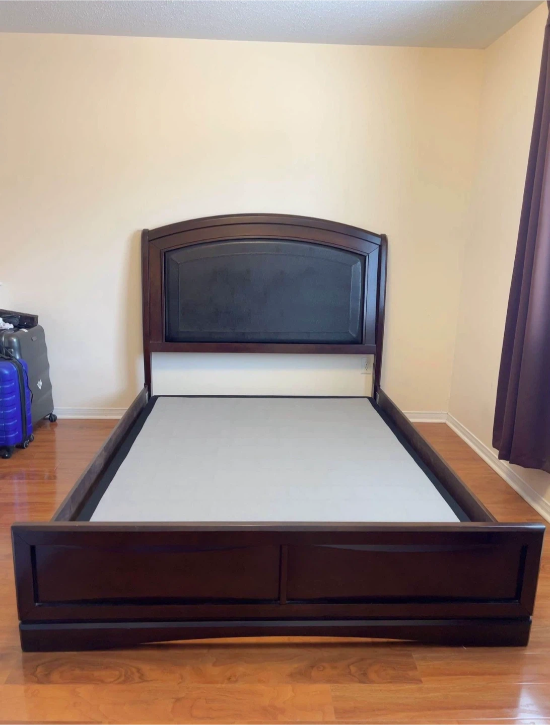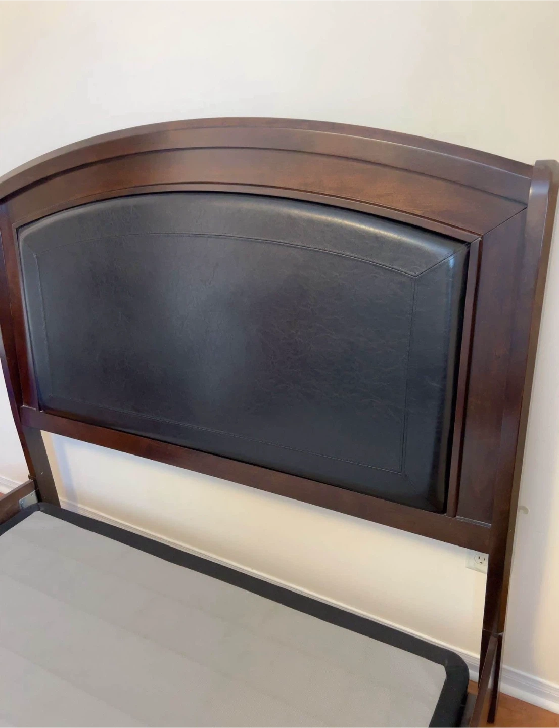 Selling a full-size bed frame in dark wood. It's in good condition and ready for a new mattress. The headboard features a black leather-like panel.Box is included in the price.