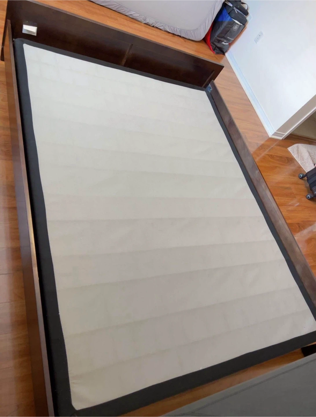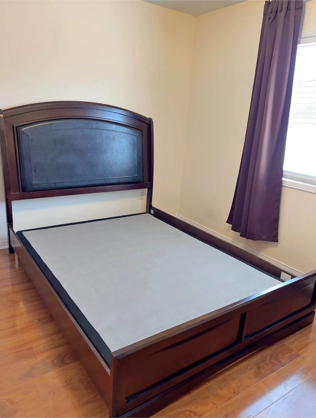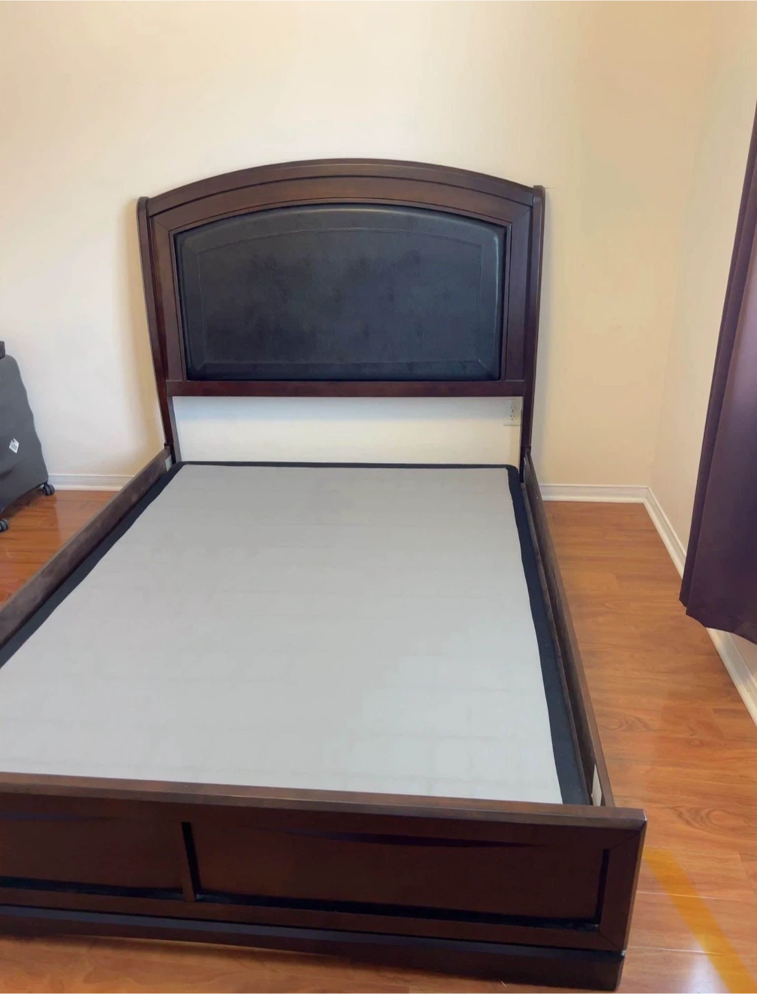 Selling a full-size bed frame in dark wood. It's in good condition and ready for a new mattress. The headboard features a black leather-like panel.Box is included in the price.