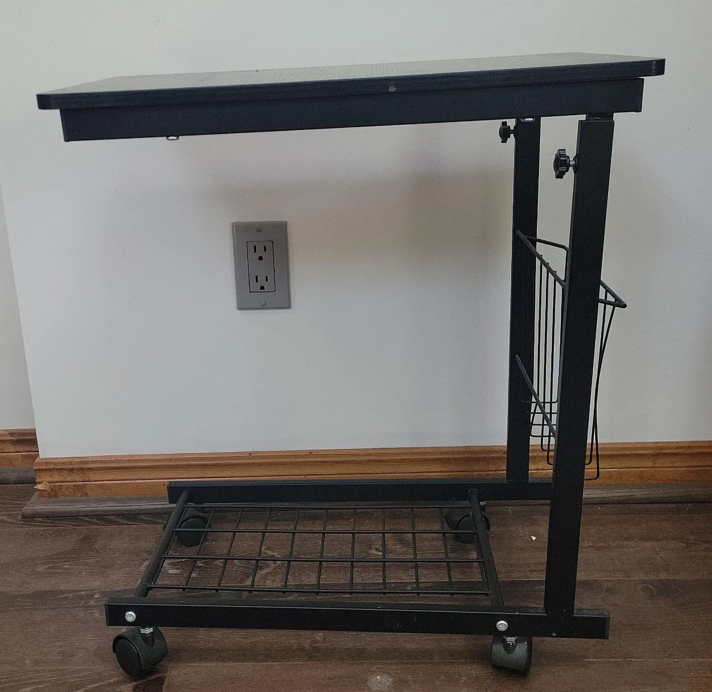 This is a rolling table cart with an adjustable height feature. It is black and has a magazine rack on the side and a storage rack on the bottom. It's perfect for use as a side table or for crafting