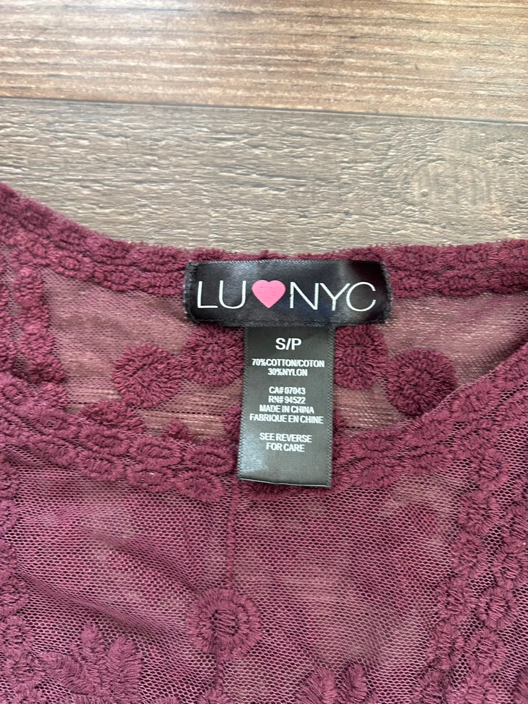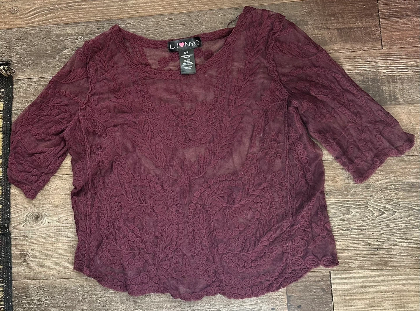 This is a beautiful lace top from Lu NYC in size S/P. It's made of 70% cotton and 30% nylon. The colour is a lovely dark red. Perfect for adding a touch of elegance to any outfit!