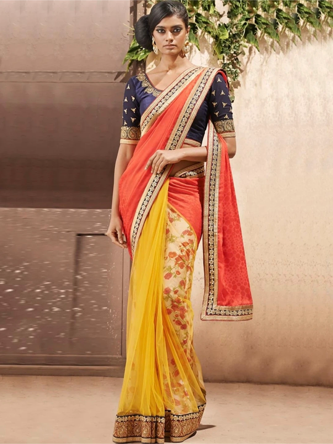 Beautiful sari with a unique colour combination of yellow, orange, and blue! The intricate detailing along the borders adds a touch of elegance