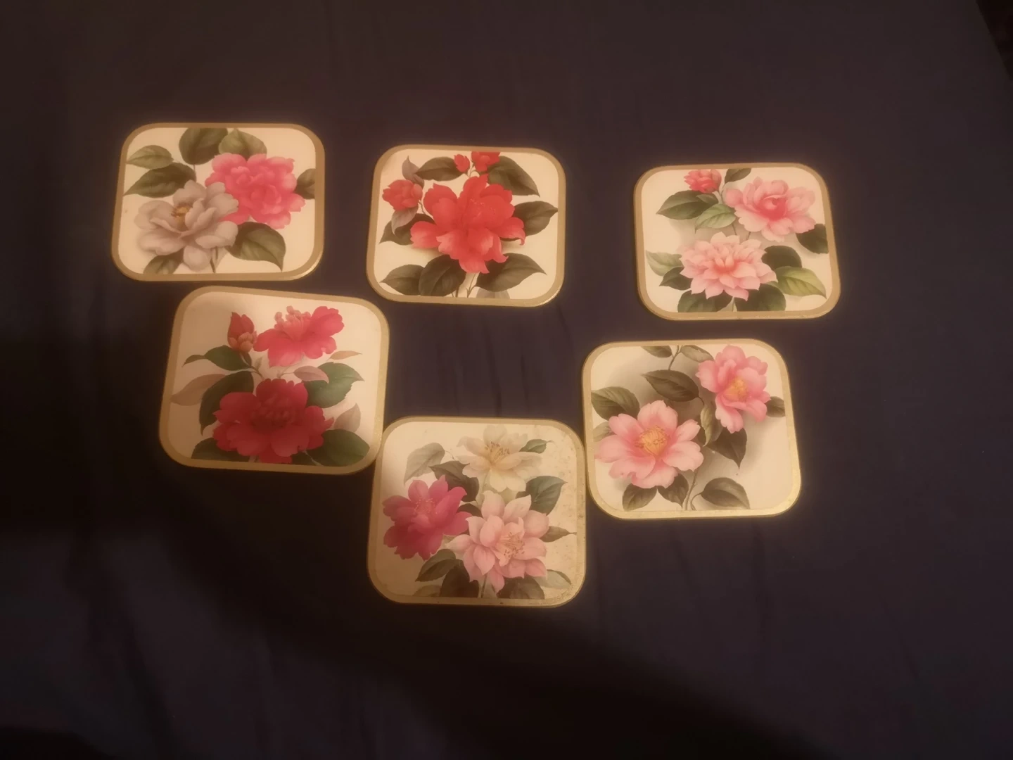 Selling a set of six vintage floral coasters. They are square with rounded corners and feature different floral designs on each coaster. Perfect for adding a touch of vintage charm to your home!