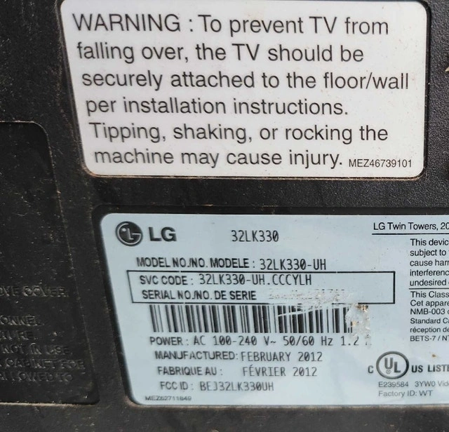 I'm selling an LG 32LK330 television, perfect for a small space or as an extra screen! It's a 32-inch LCD TV that delivers a clear picture and reliable performance. This TV has been well-maintained and is in good working condition. I have measured the TV to be about 29 inches wide. It has a manufacture date of February 2012.