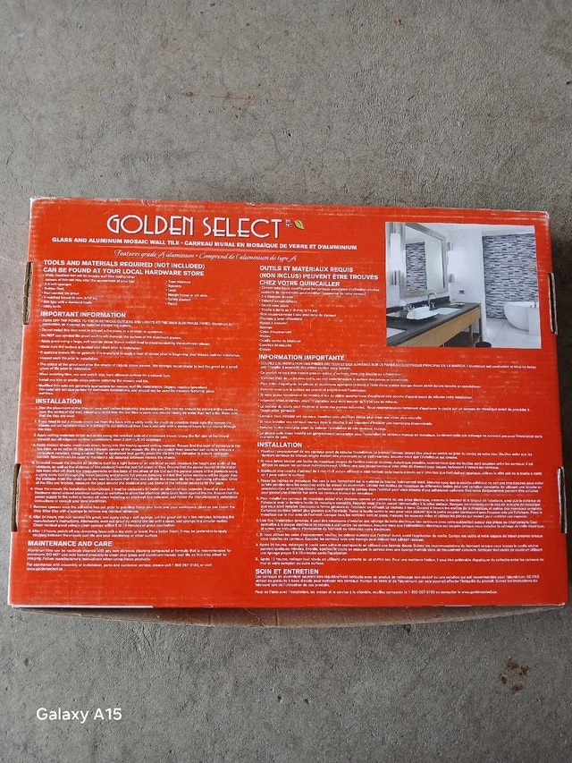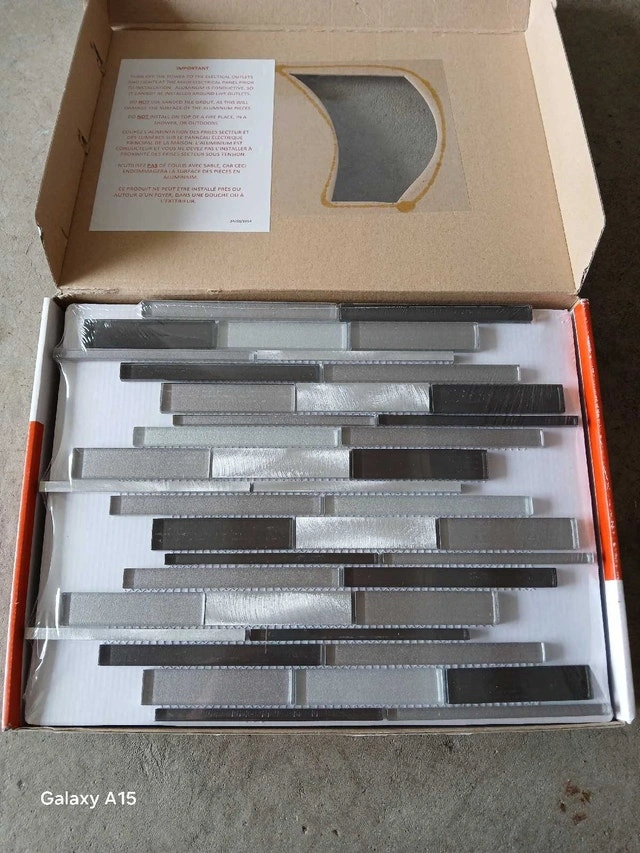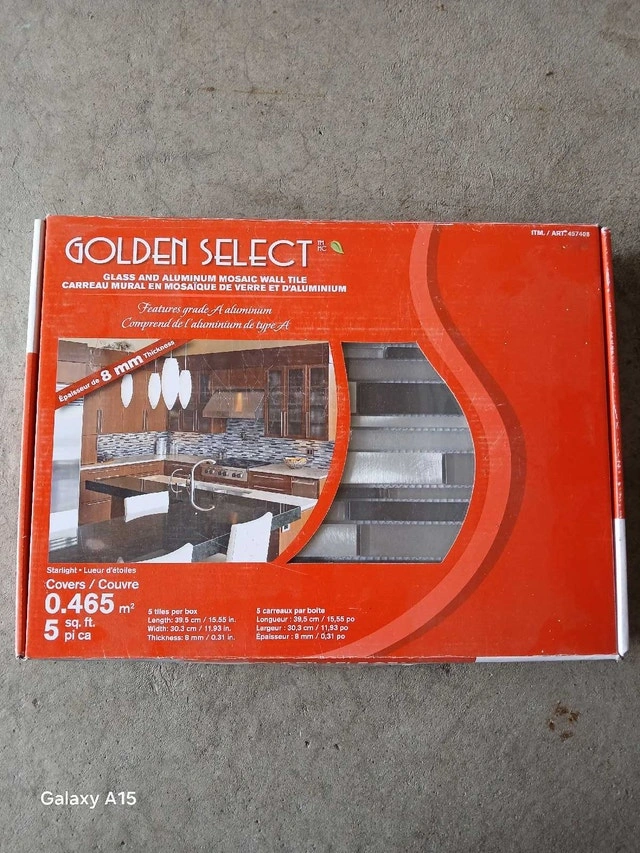 "Golden Select" Glass and Aluminum Mosaic Wall Tile 5 tiles per box Length 39.5cm Width 30.3cm Thickness 8mm Each box covers 0.465 square meters (5 square feet) 3 full boxes for CAD80 + plus 1 unfull box for free