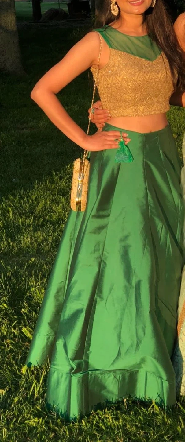 Selling a beautiful green lehenga skirt with a gold top. It's in great condition and perfect for a special occasion!