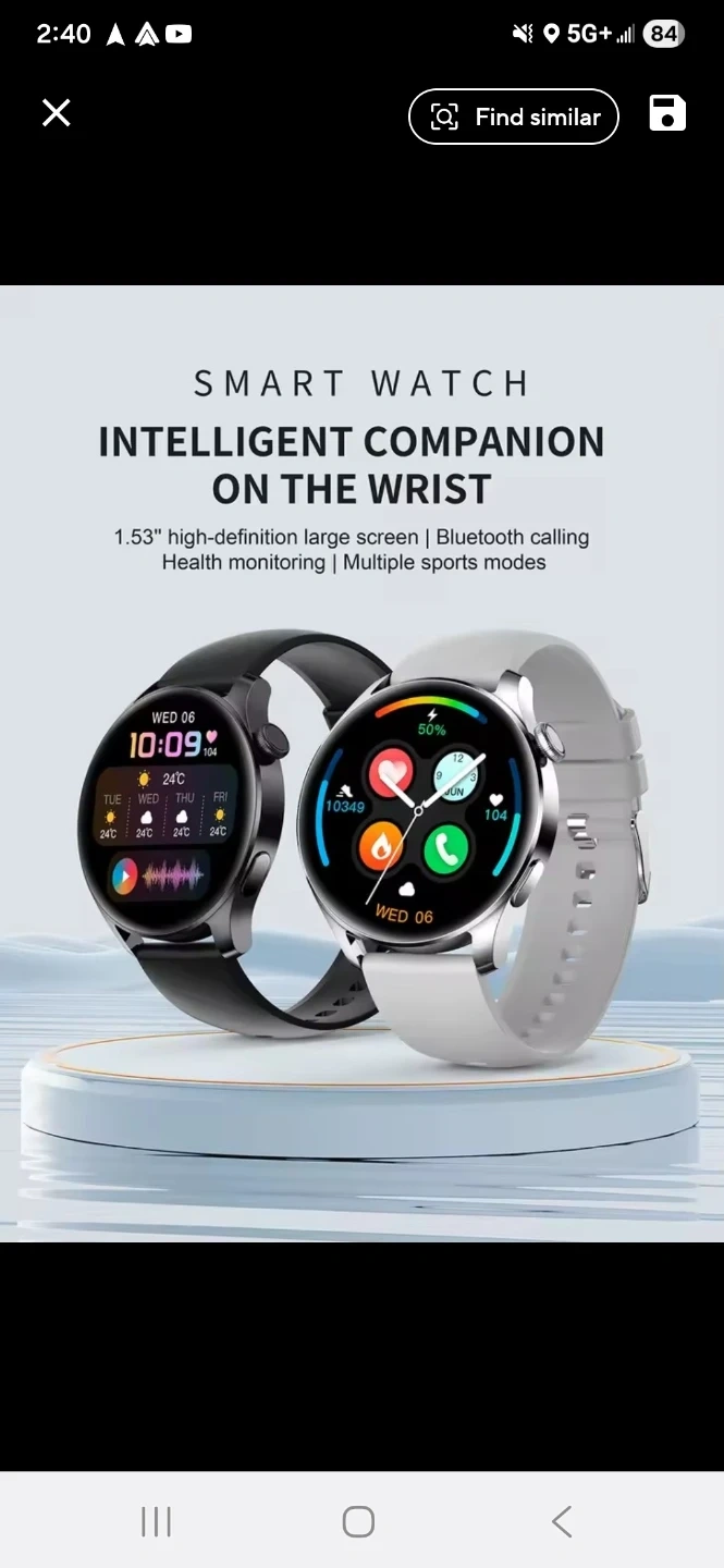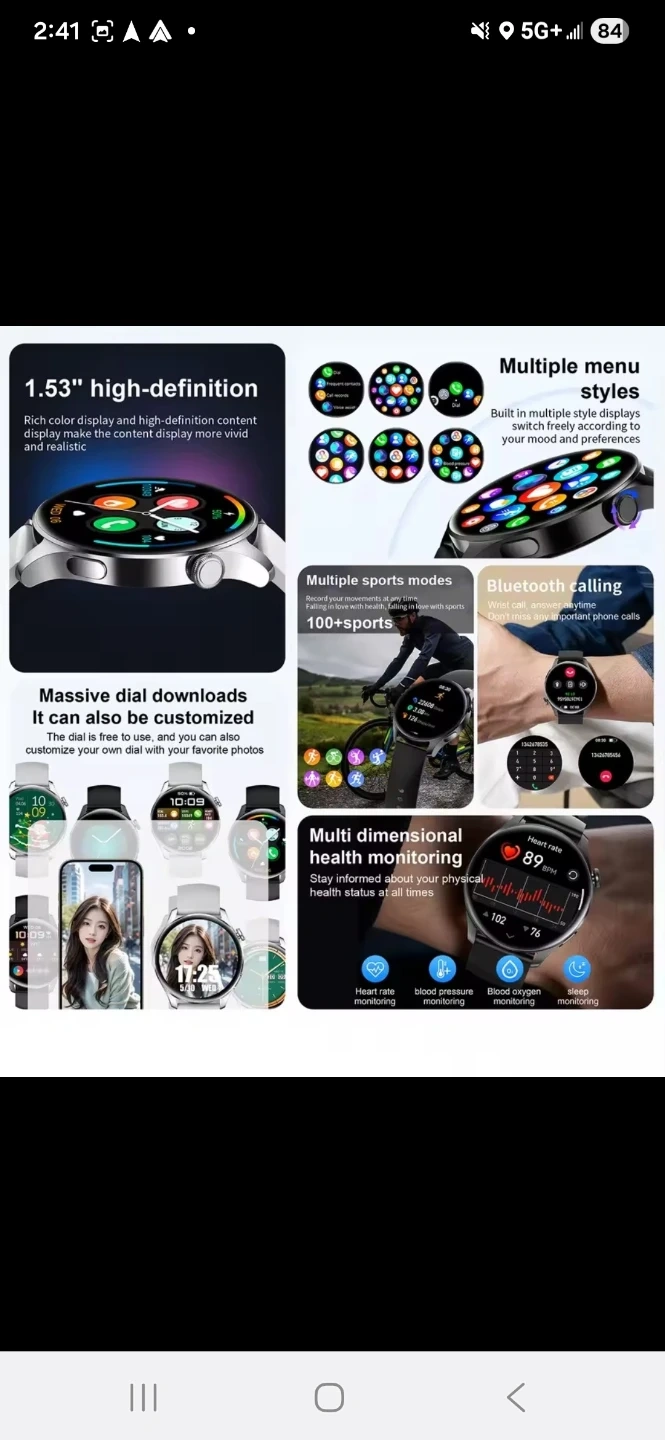 This smart watch is an intelligent companion on the wrist! It features a 1.53" high-definition large screen and Bluetooth calling. It also has health monitoring and multiple sports modes. The watch has a 360*360 resolution and a full screen touchable touch method. It also has multiple menu styles and a rotating button easy control interface